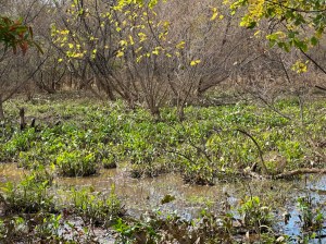 As Coleman and I were walking along the trail (and even a little off trail) around the Riverside Greenway, I noticed a marshy area where the flood waters were still surrounding many plants and vegetation. Other areas where the flood waters had recently receded were still mushy and difficult to walk through, but Coleman is a trooper and loves to explore everything. With all the devastation caused by the storm and strong winds, I was amazed to see signs of new plant life sprouting in amongst the tremendous amount of leaves near fallen trees. No matter how things may seem, God is in control. New life begins once again.