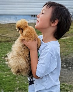Our new neighbours have chickens in their backyard. Sometimes they fly over the fence and wander around our backyard. While visiting with the neighbours, Coleman chased the chickens in between jumping on their trampoline. As you can see after several tries, Coleman caught one of the chickens. This one is a Silkie chicken; they are known for their fluffy, silk-like plumage. They are flightless, but they sure can run when being chased by a little boy.