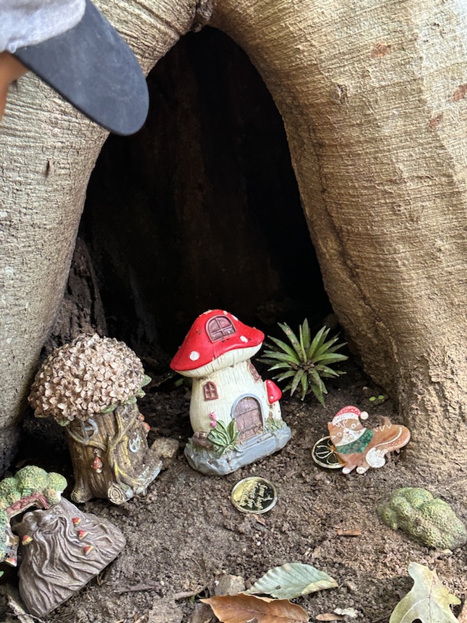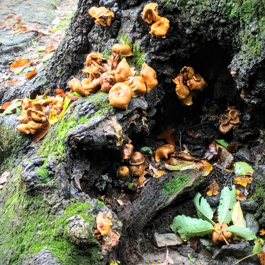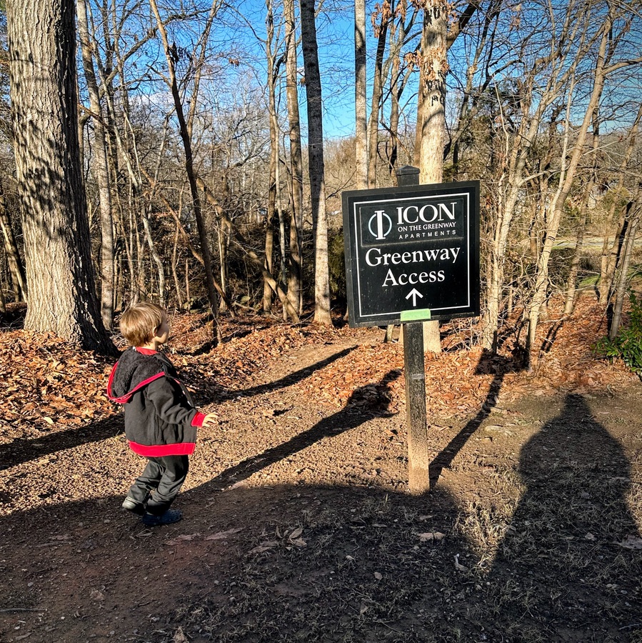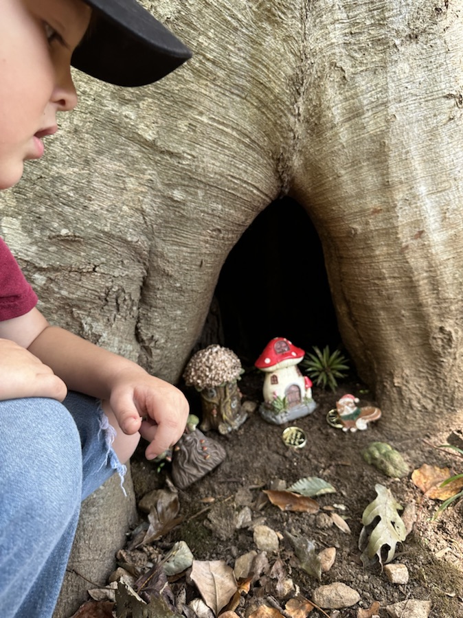 Hiking along Steele Creek Trail at Anne Springs Close Greenway, Coleman and I stopped to pay a visit to the Hobbit’s Homes before continuing on our way. If you’re not looking carefully you could miss seeing the Hobbit’s Homes hidden within the tree.