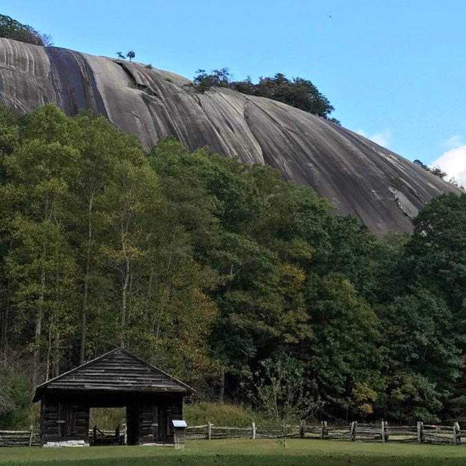 Stone Mountain State Park is located in Alleghany and Wilkes counties 60 miles northwest of Winston-Salem. Within the Park lies a 600-foot granite dome which has been designated as a National Natural Landmark, and the historic Hutchinson Homestead, a restored mid-19th-century farm situated at the mountain base.