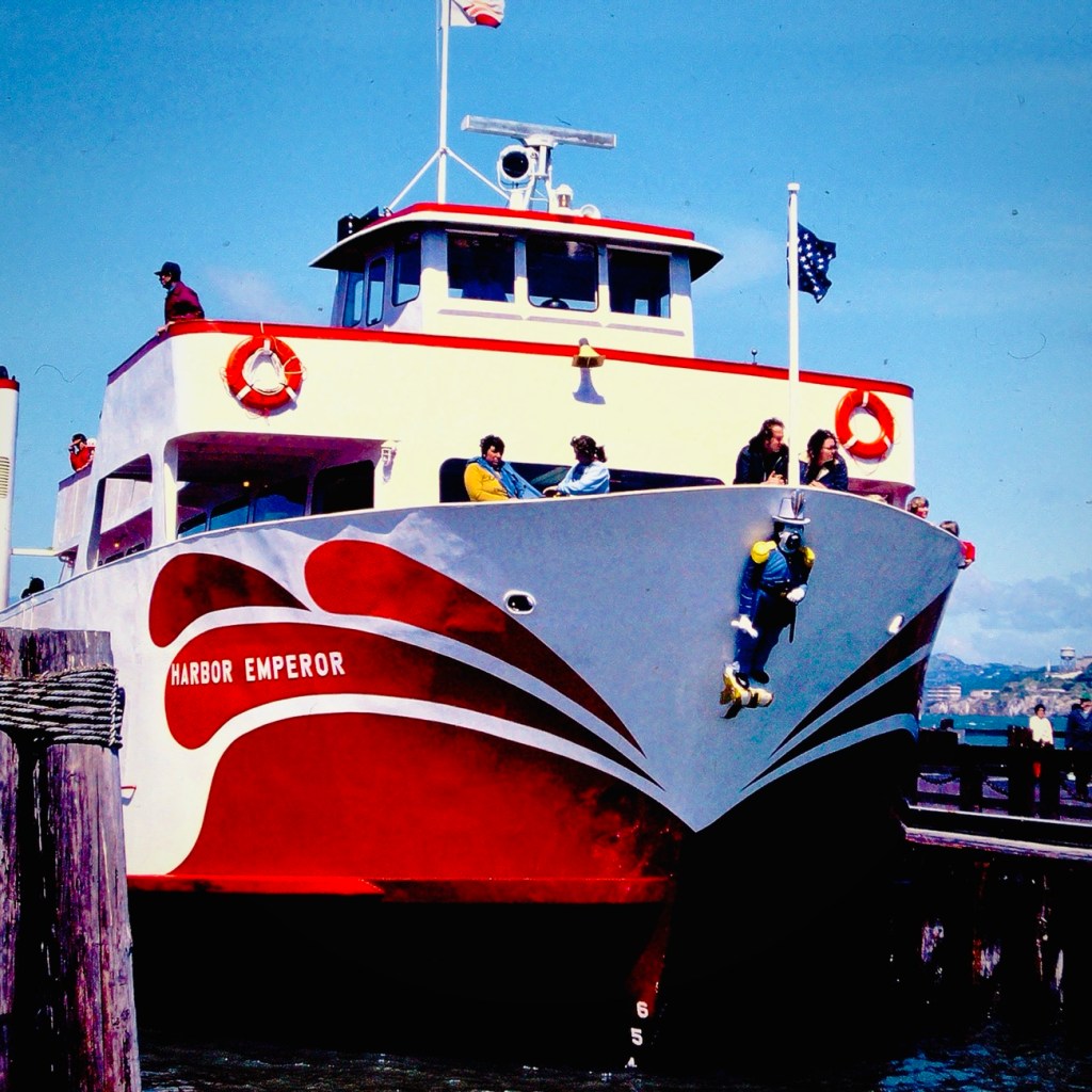 The South Wind pulls alongside the pier … excited fishermen watching “patiently” for their turn to go out on the boat.