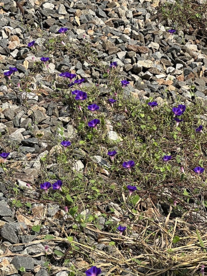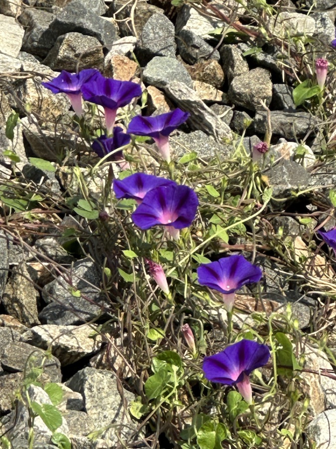 These Purple Morning Glories are located on the side of a small hill below railroad tracks up the street from our home. I found it interesting how they are entwined with the gravel as they climb the hill and how they rise up towards the sky in the mornings.