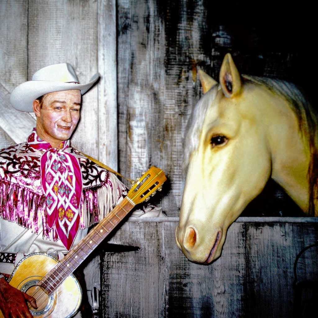 The photo was taken at the Movieland Wax Museum in Buena Park, California back in 1966 by my dad when we visited. These are wax figures of Roy Rogers and Trigger. The sign in front of the display (not pictured here) states CO. REPUBLIC 1945; “DON’T FENCE ME IN”; ROY ROGERS; DIR. ENGLISH; PROD. DONALD H. BROWN; SCENE N. 20; TAKE NO; EXT: STABLE.