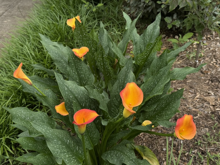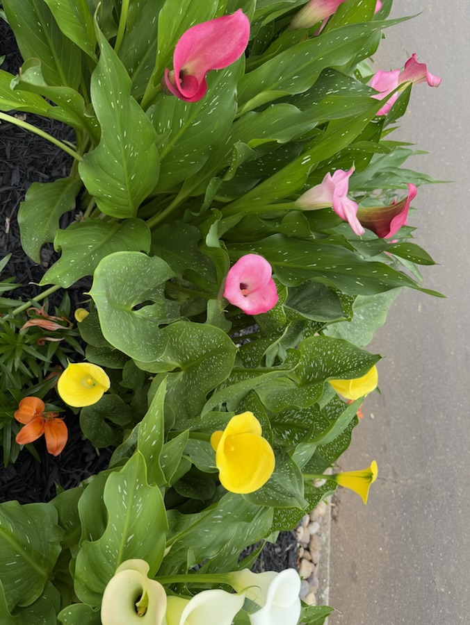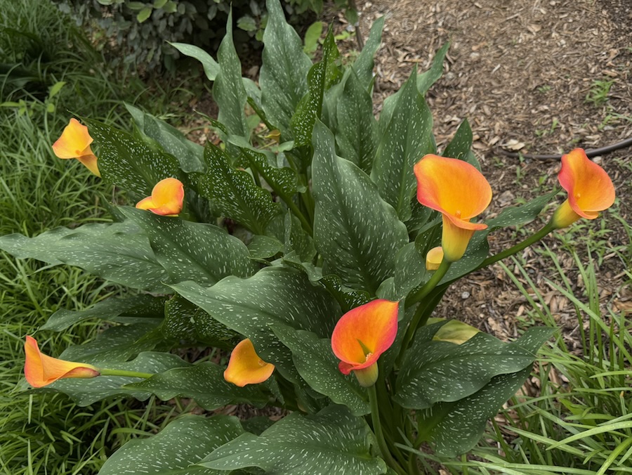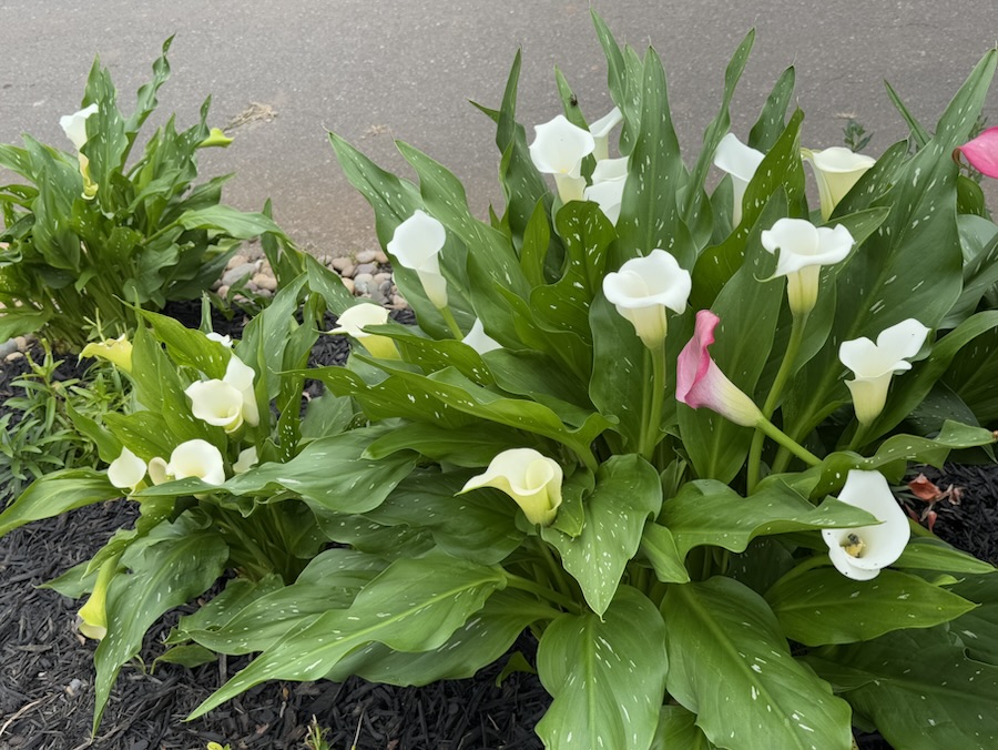 Calla Lilies may multiply spreading through their underground rhizomes, which develop additional growth buds and can be divided to create new plants. These particular Calla Lilies have been divided and multiplied continuously over time.