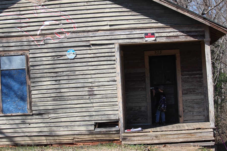 The Baltimore Village School sits on a hill near the South Fork Catawba River. Inside the building are cracked windows covered by boards, an old refrigerator on one side of the room, and patches of peeling paint hanging off the roof.
