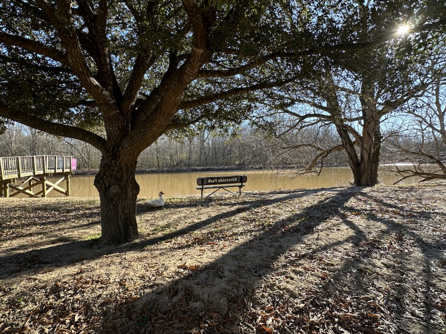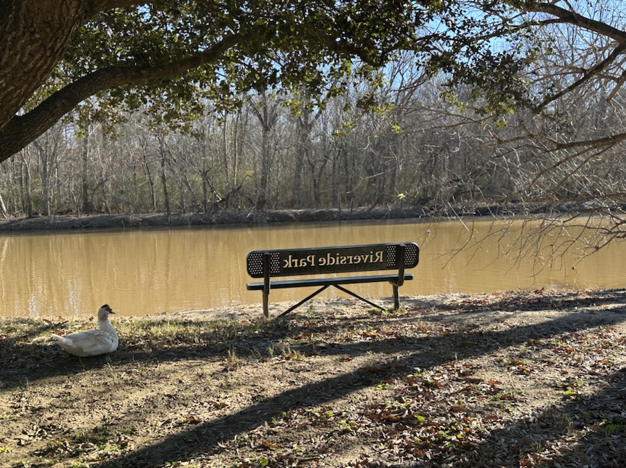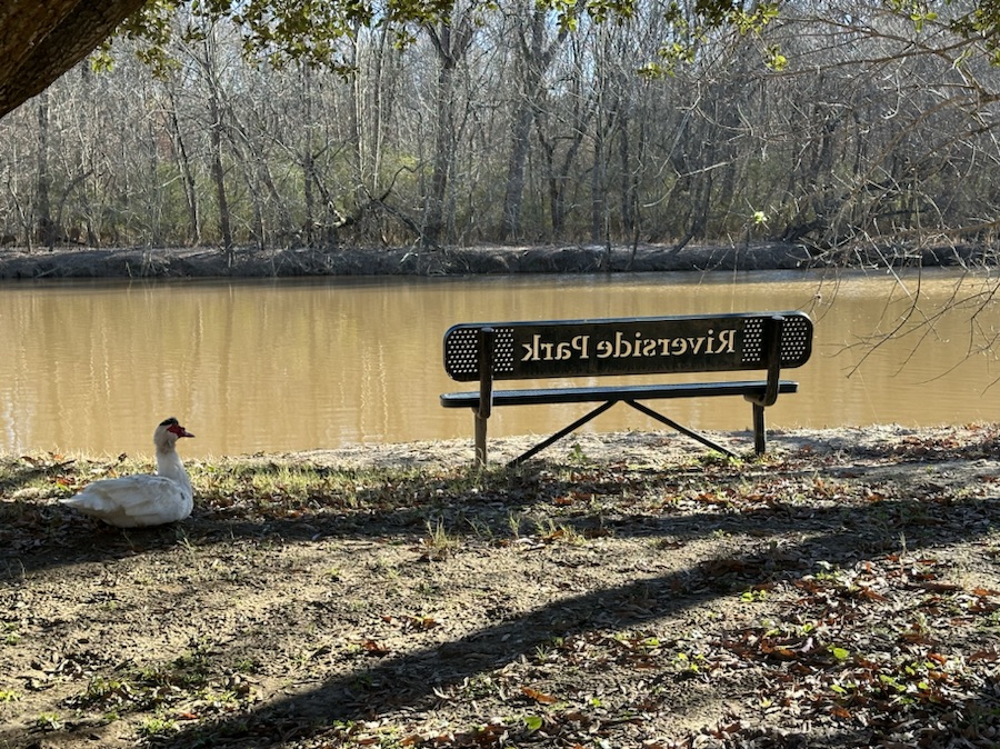 When Coleman and I visited the Greenway on New Year’s Afternoon we actually Pulled Up a Seaton a bench on the other side of the Pier. Couldn’t resist taking a picture of this one with the resident Muscovy Duck sitting nearby.