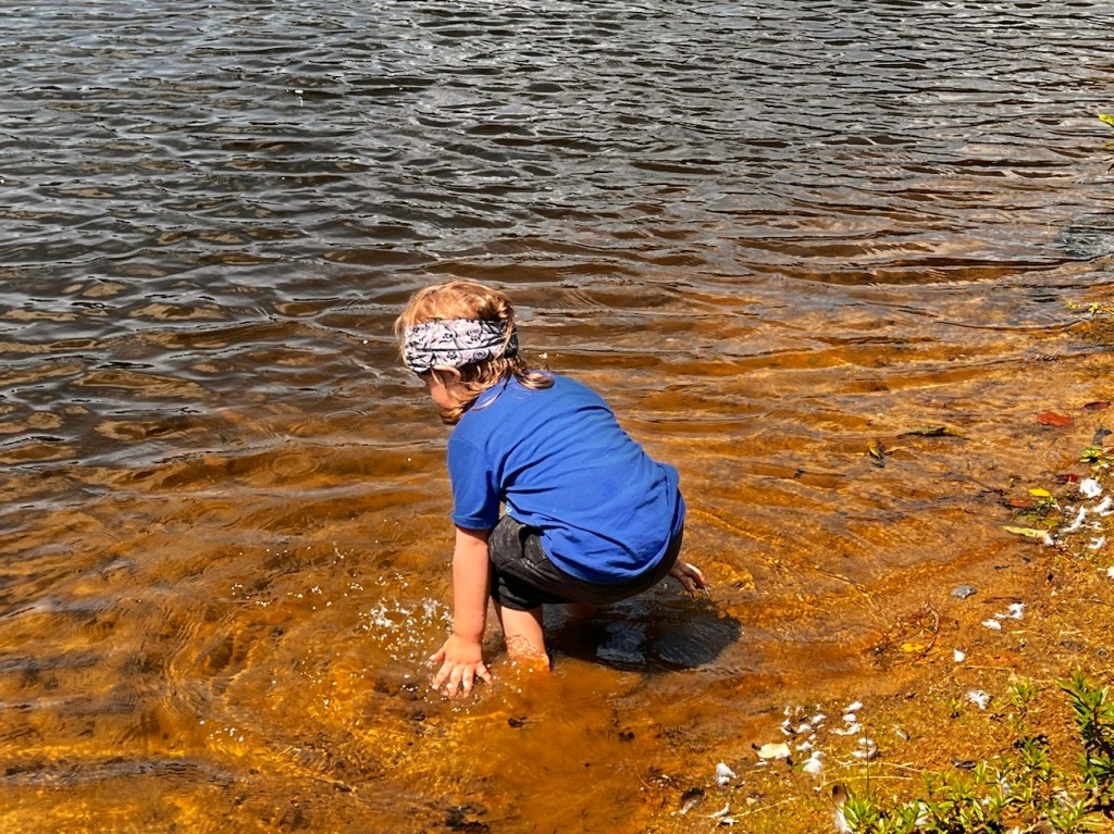 Shortly after we began hiking along the Dogwood Trail, we came upon the Airport Pond. We enjoyed the views of the water and the reflections within the water. Whenever possible my grandson loves to play in the water either with his hands or his whole body. Luckily on this day it was just his hands.