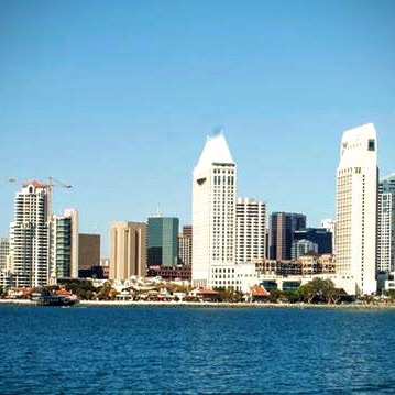 View of San Diego High-rises from across San Diego Bay. The Manchester Grand Hyatt Hotel is one of several High-Rises located near Seaport Village.