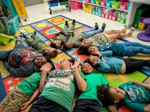 Nine Students and a teacher all wearing green and embracing togetherness in the classroom.