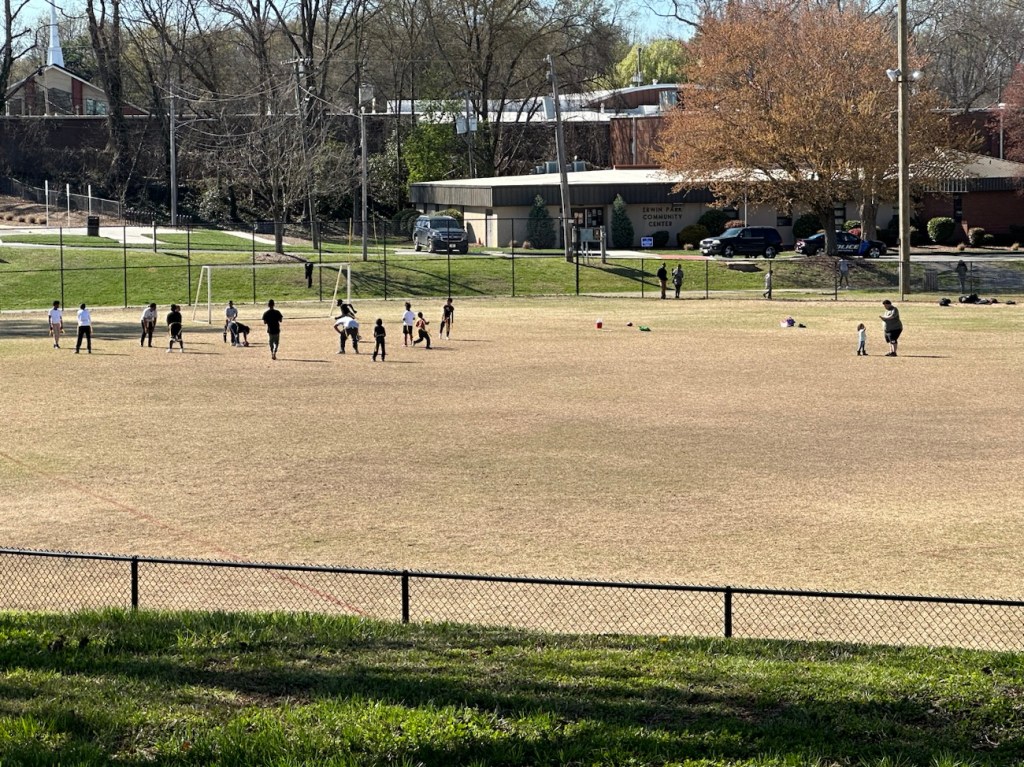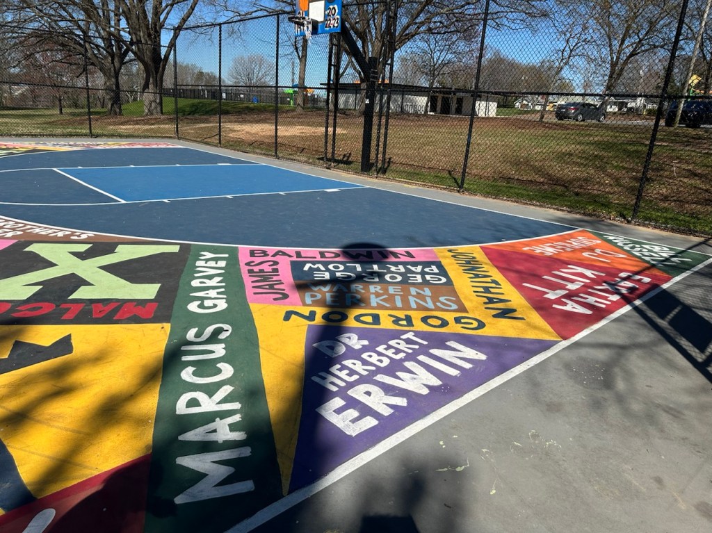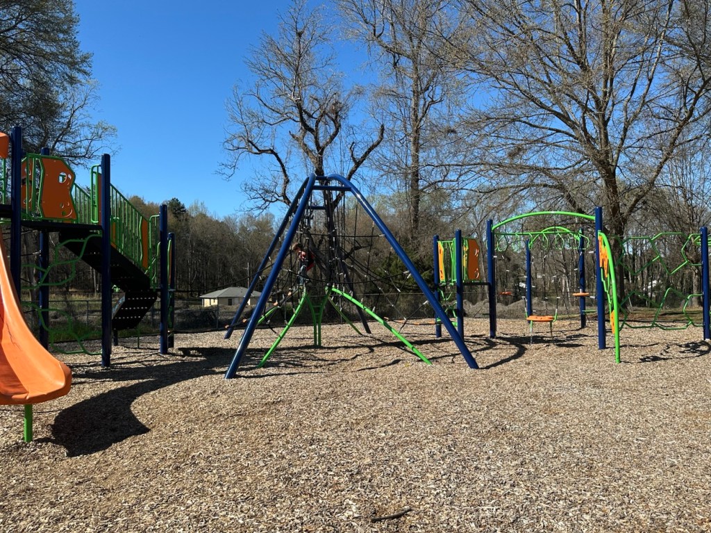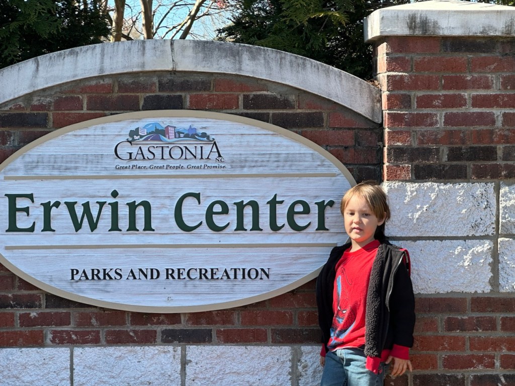 Gastonia Erwin Center Parks and Recreation Sign with Coleman Basketball Court Gastonia Erwin Center Park and Recreation Ball Field used for Soccer and Baseball Gastonia Erwin Center Park and Recreation Coleman in the Children’s PlaygroundColeman sliding on the Playground Equipment Slide