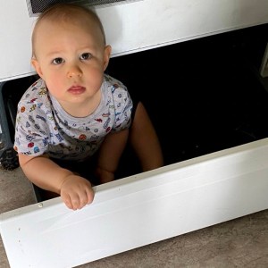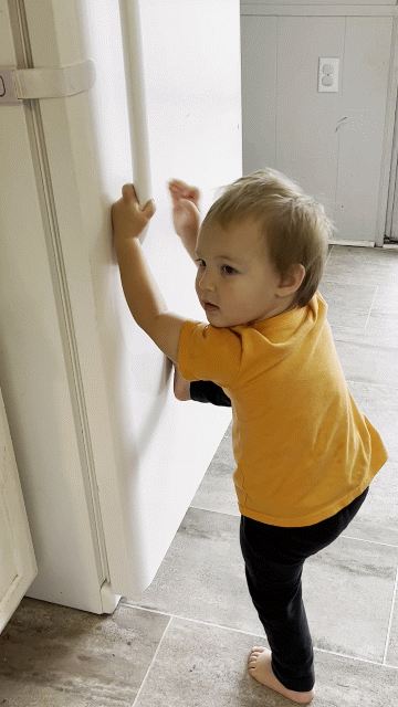 In this last photo (animation) we had a “lock” on the Refrigerator Door to try to keep him from getting into it. As you can see it didn’t keep him from trying.