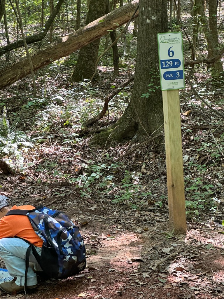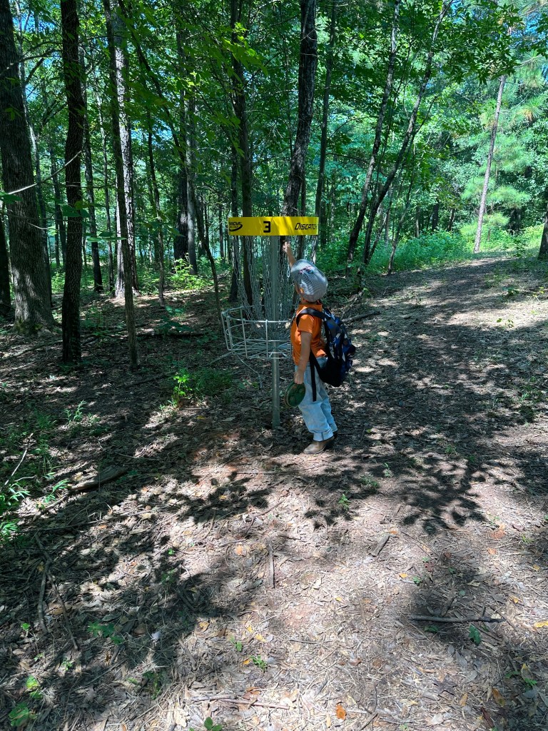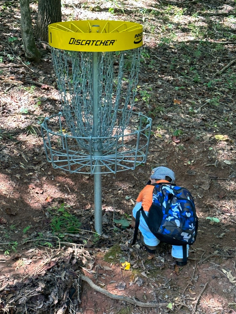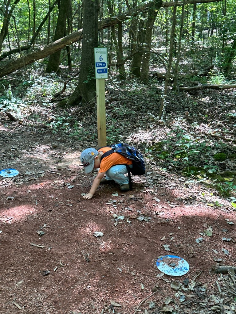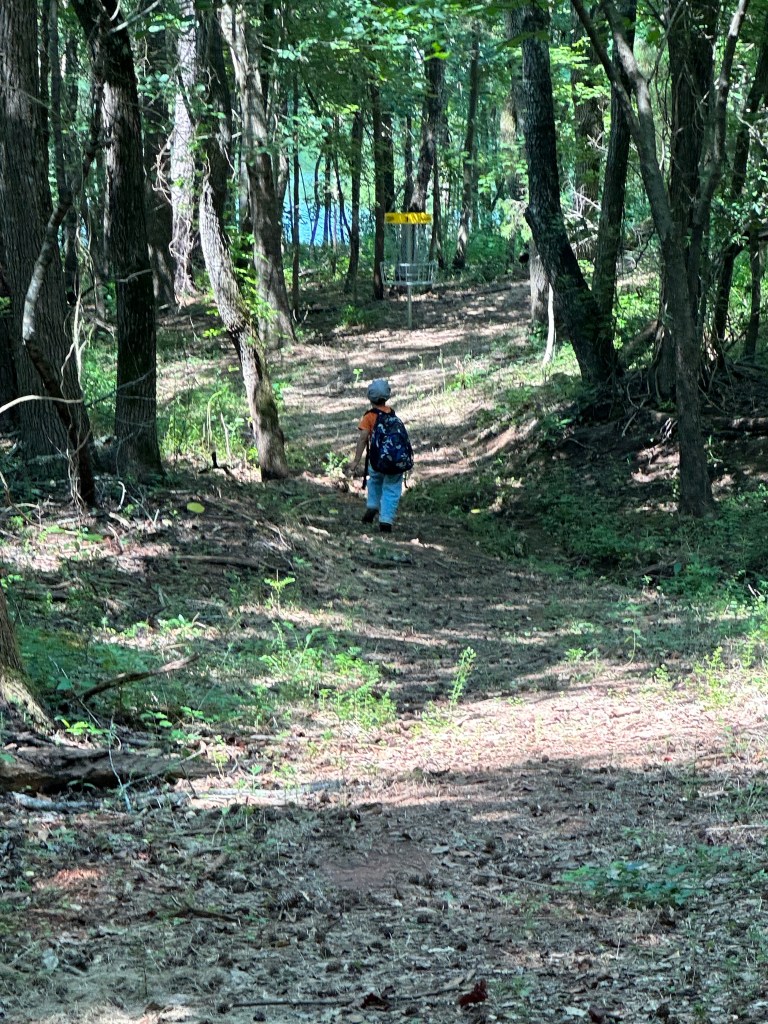 We started out along the paved hiking trail and meandered over to the dirt disc golf trail which runs simi-parallel to the South Fork Catawba River. While walking adjacent to the river, Coleman pointed out that there was a man standing in the river. This is not a normal sight when we are hiking. Therefore, we proceeded to investigate what the man was doing wading in the South Fork Catawba River.