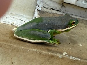 After my finally seeing the Little Green Frog I proceeded to capture the Little Green Frog and escort him outside. Once outside I set the Little Green Frog down on the porch by the stairs. The Little Green Frog merrily hopped down the stairs and into the vast greenness of our front yard. And we said goodbye Little Green Frog.