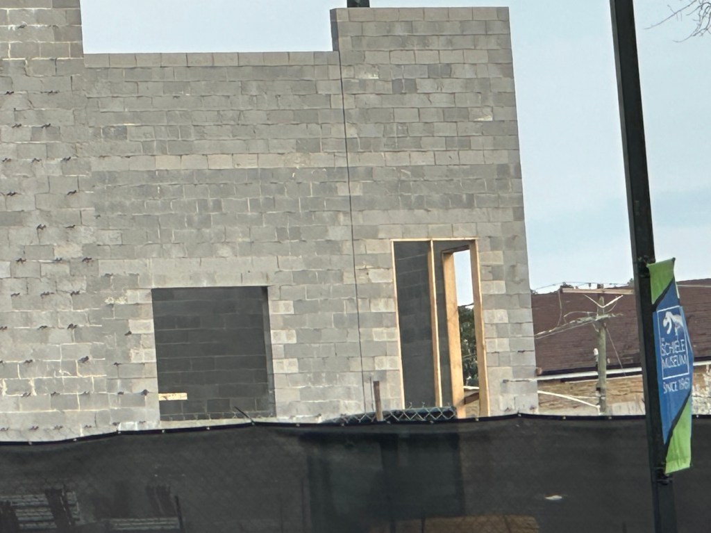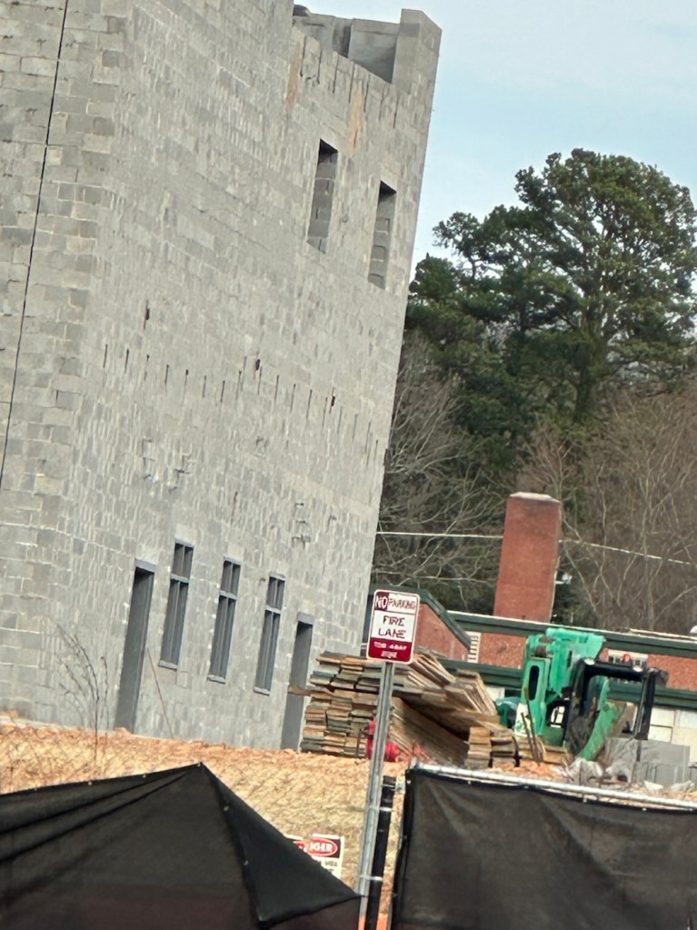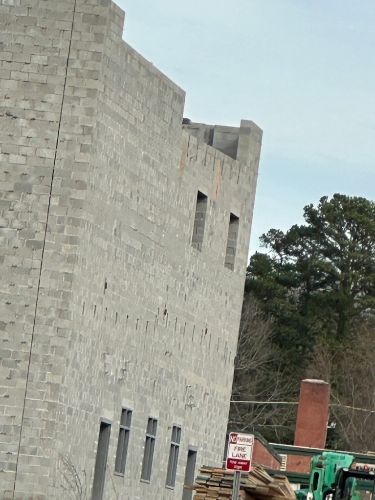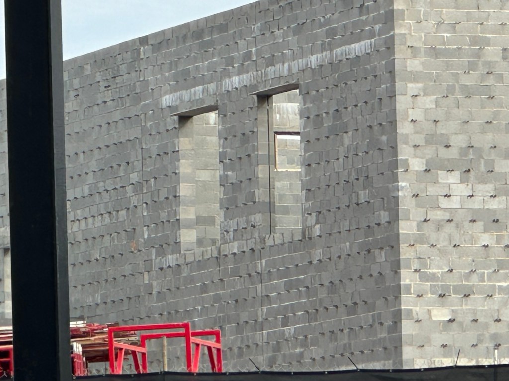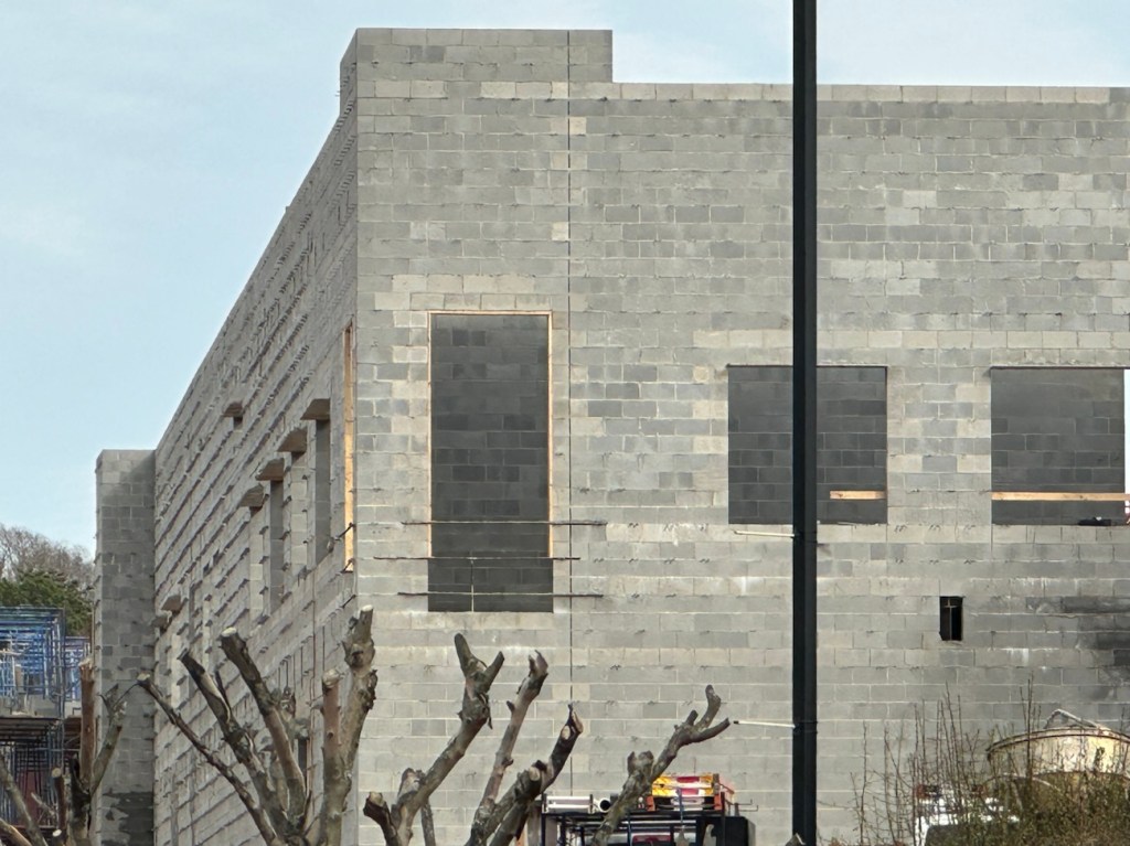The construction of the new school is coming along nicely now that spring is on the way. You can observe the different sizes and shapes of the windows taking shape in the school buildings.