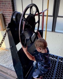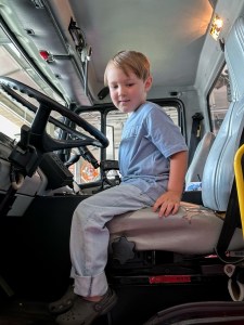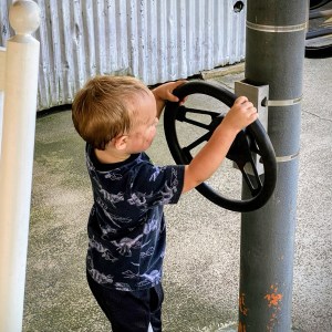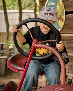 Coleman testing out the Steering Wheel of a Tractor at The Farm at The Schiele Museum of Natural History.