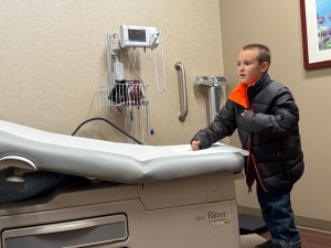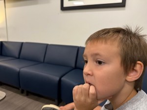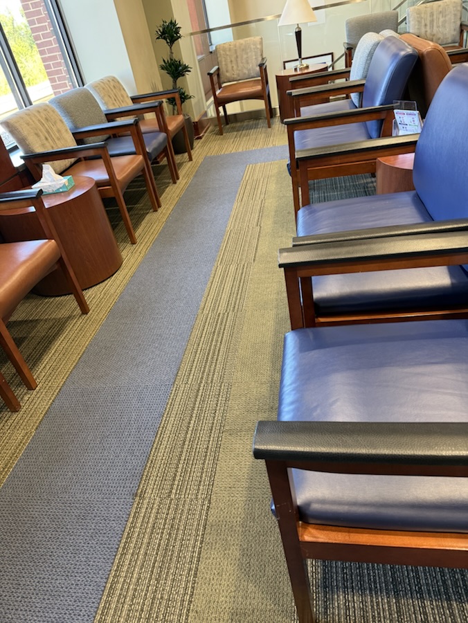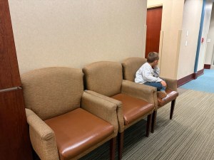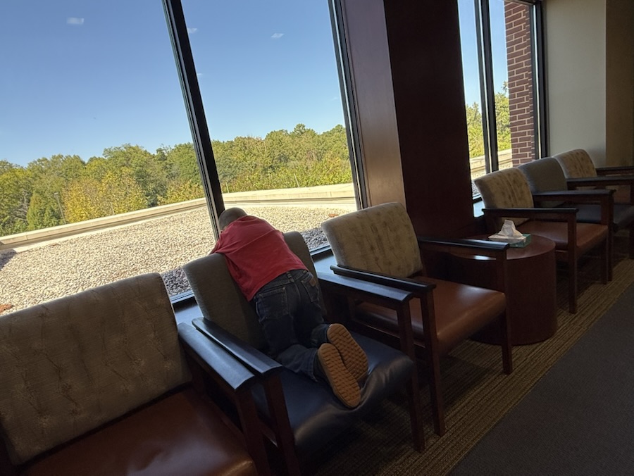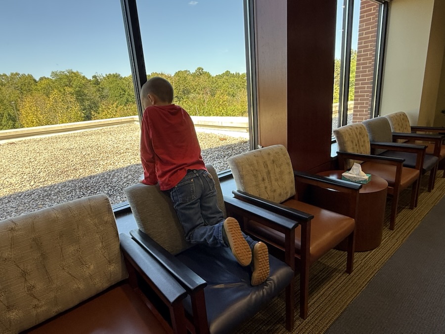 In a medical center waiting room while we wait for Coleman’s mom to finish with her appointment.