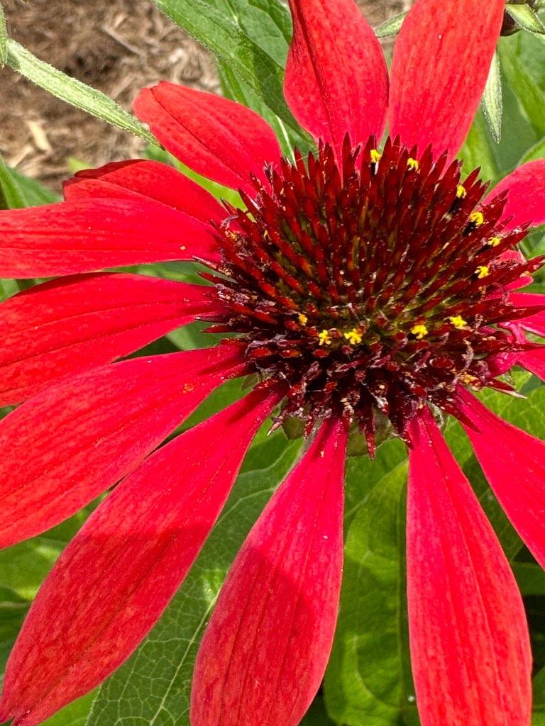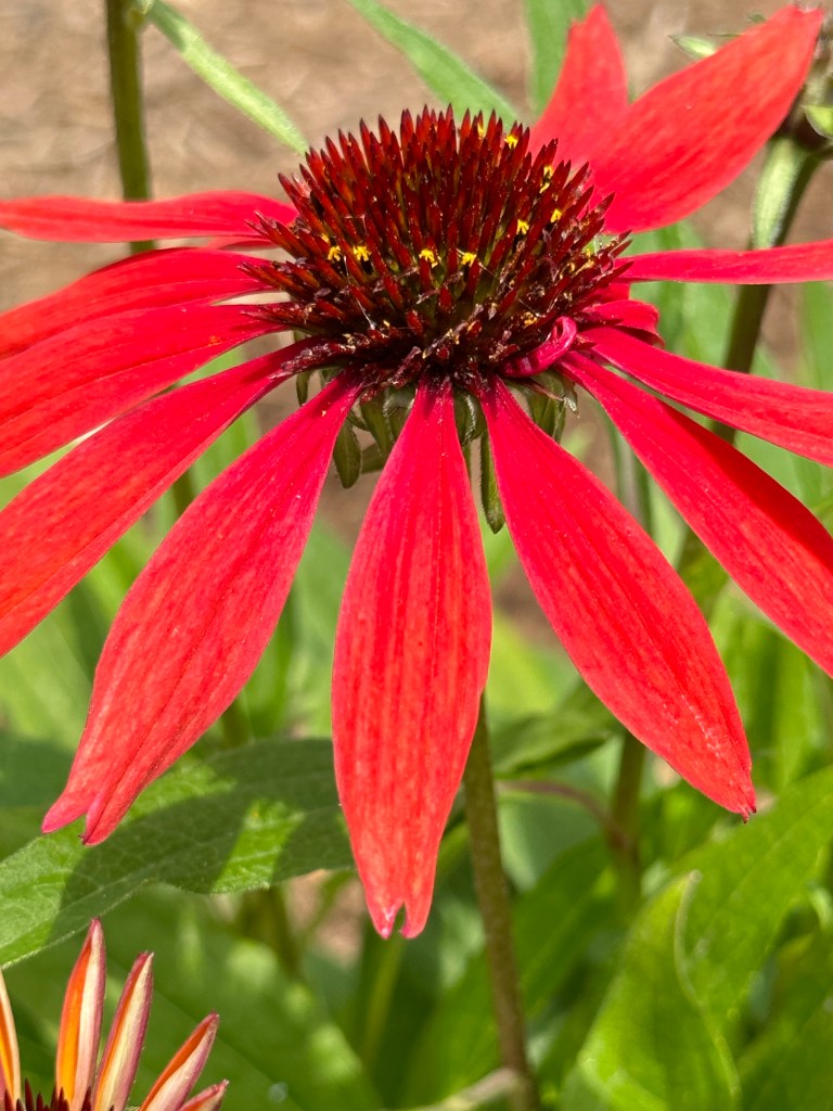 Echinacea Sombrero Salsa Red displays single rows of drooping, deep orange-red ray petals around a sombrero-shaped, orange-brown cone. The lightly fragrant flowers attract butterflies! They provide long lasting color in the garden.