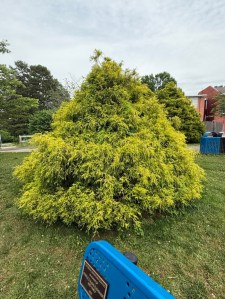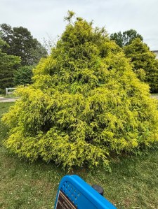 This is a Golden Threadleaf Sawara Cypress, Chamaecyparis pisifera ‘Filifera Aurea’ tree. It is sumptuous, perhaps overly so although lovely to look upon. It has a bold, seamless yellow coat of drooping, thread-like foliage that sits like a huge canary-gold Easter Egg. The brilliant color of the Golden Threadleaf Sawara Cypress appeals to everyone mostly, however, its bold yellowish colour may not be pleasing to some folks.