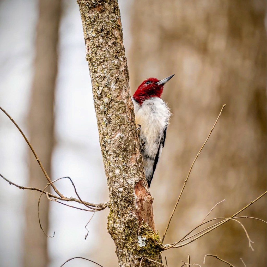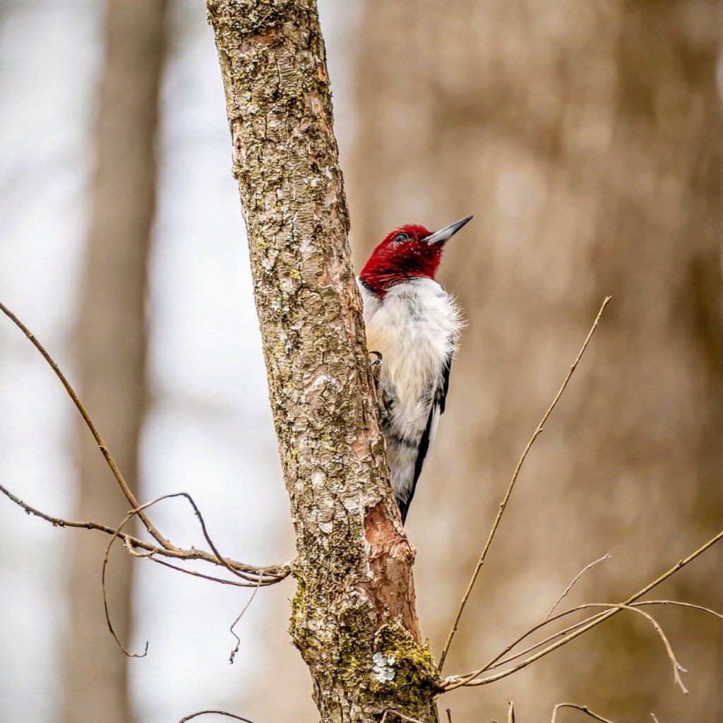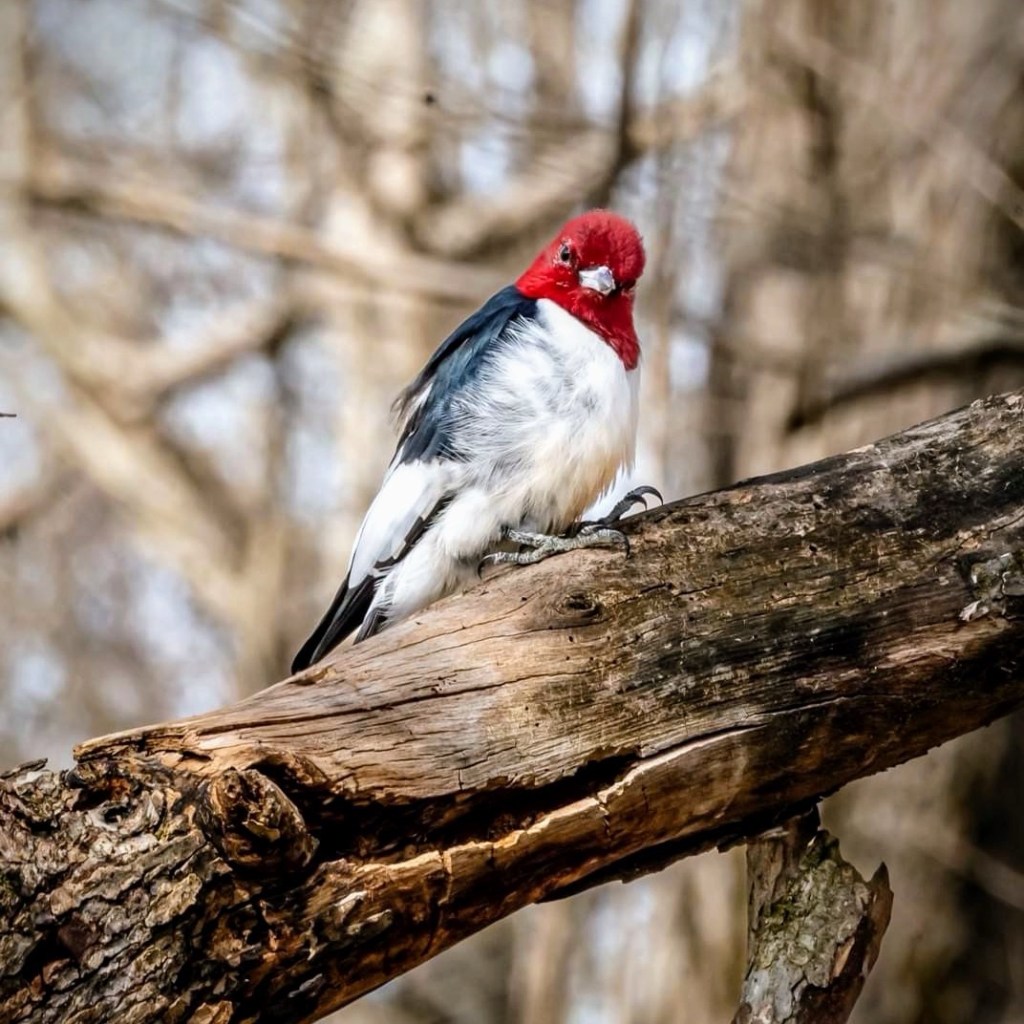 Red-headed Woodpeckers have an entirely red head, and their belly is white and unstreaked. It is a mid-sized woodpecker found in temperate North America. Its breeding habitat is open across southern Canada and the east-central United States. One should not confuse the red-headed woodpecker with the red-bellied woodpecker. Even though they are similar in size, the red-bellied woodpecker is named for the pale reddish blush of its lower belly and has a distinct patterned black and white back whereas the red-headed woodpecker has the solid black back and a vibrant orange-red crown and nape. These Red-headed woodpeckers were spotted at the Anne Springs Close Greenway in Fort Mill, South Carolina.