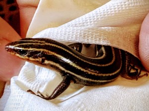 They are small to medium in size, growing to approximately 12.5 to 21.5 centimetres (4.9 to 8.5 in) total length (including tail). The young American Five-lined skinks are dark brown to black with five distinct white to yellow stripes (this one’s are yellowish) running along the body and a bright blue tail. The blue color fades to light blue with age, and the stripes also may slowly disappear.
