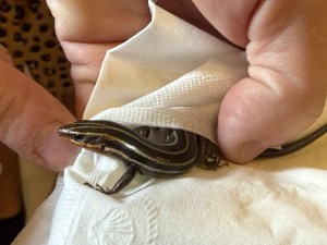 The common five-lined skink’s diet consists primarily of a variety of arthropods, particularly spiders, crickets, beetles and other insects. However, they have been reported to also eat newborn mice, frogs, and other lizards. [Tiny frogs, beetles, spiders, and other insects are easily found along the banks of the South Fork Catawba River, easy feasts for skinks].