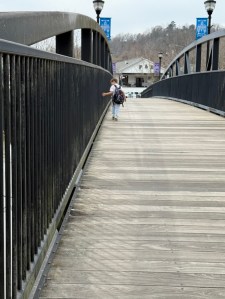 Coleman running back and forth on the Blue Star Swinging Bridge wearing a RED Shirt