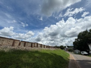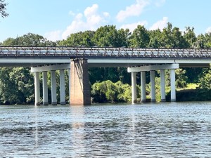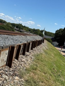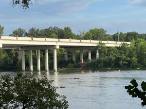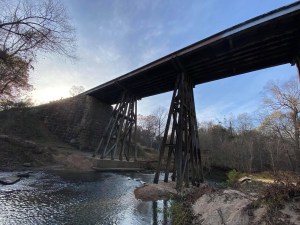 Walking alongside the South Fork Catawba River we gaze over the river and notice the lines of the trench leading to the river and in the tree on the riverbank.