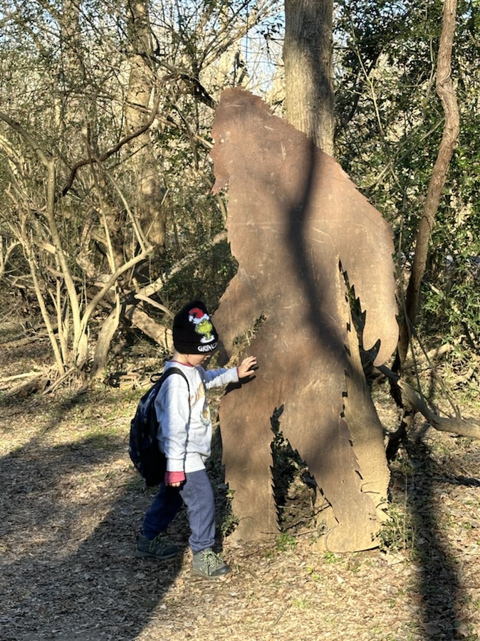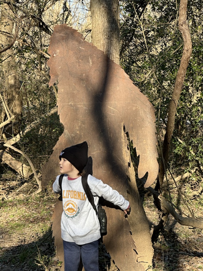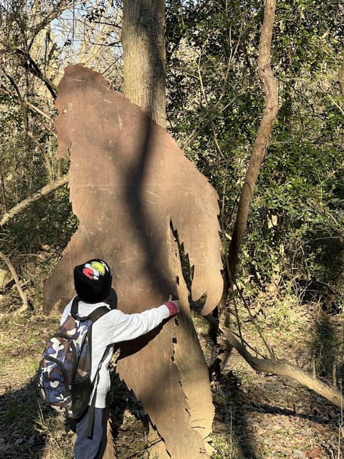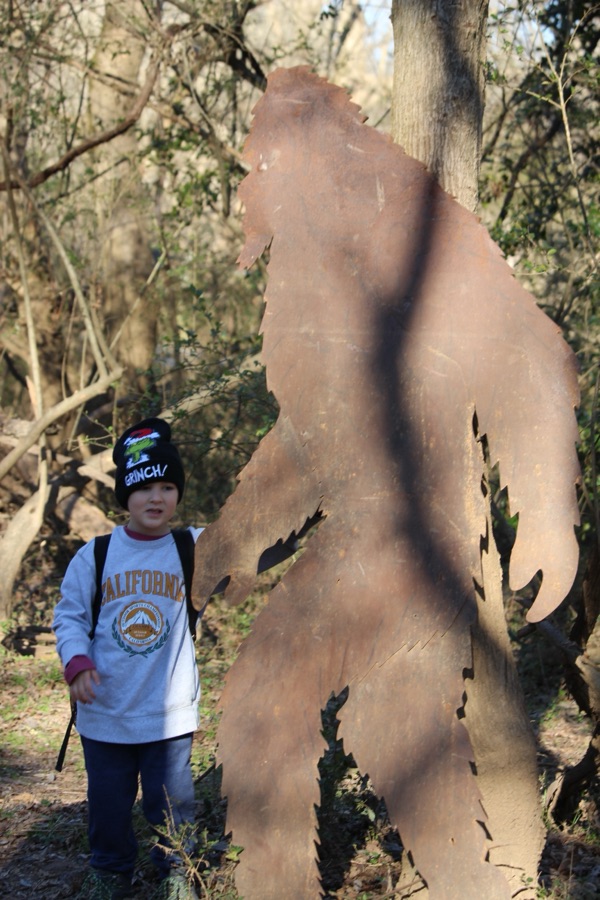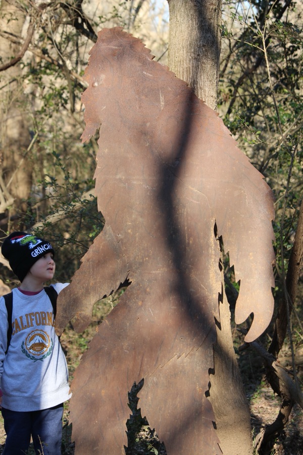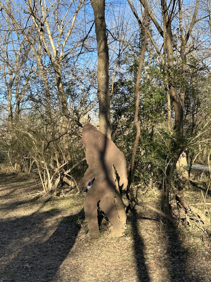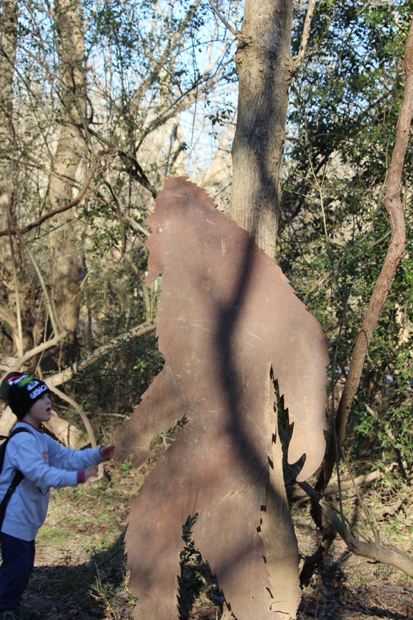 This (PPAC)of Bigfoot ( also known as Sasquatch) is located on the Disc Golf Trail at Goat Island Park and Greenway in Cramerton, North Carolina. This is the first time Coleman and I hiked this trail since Hurricane Helene. After the flood damage to the trail in the aftermath of Hurricane Helene; the trail was blocked off prohibiting access temporarily until repairs could be completed. We did not recall seeing Sasquatch previously. Coleman was fascinated by the Bigfoot and had to check it out.