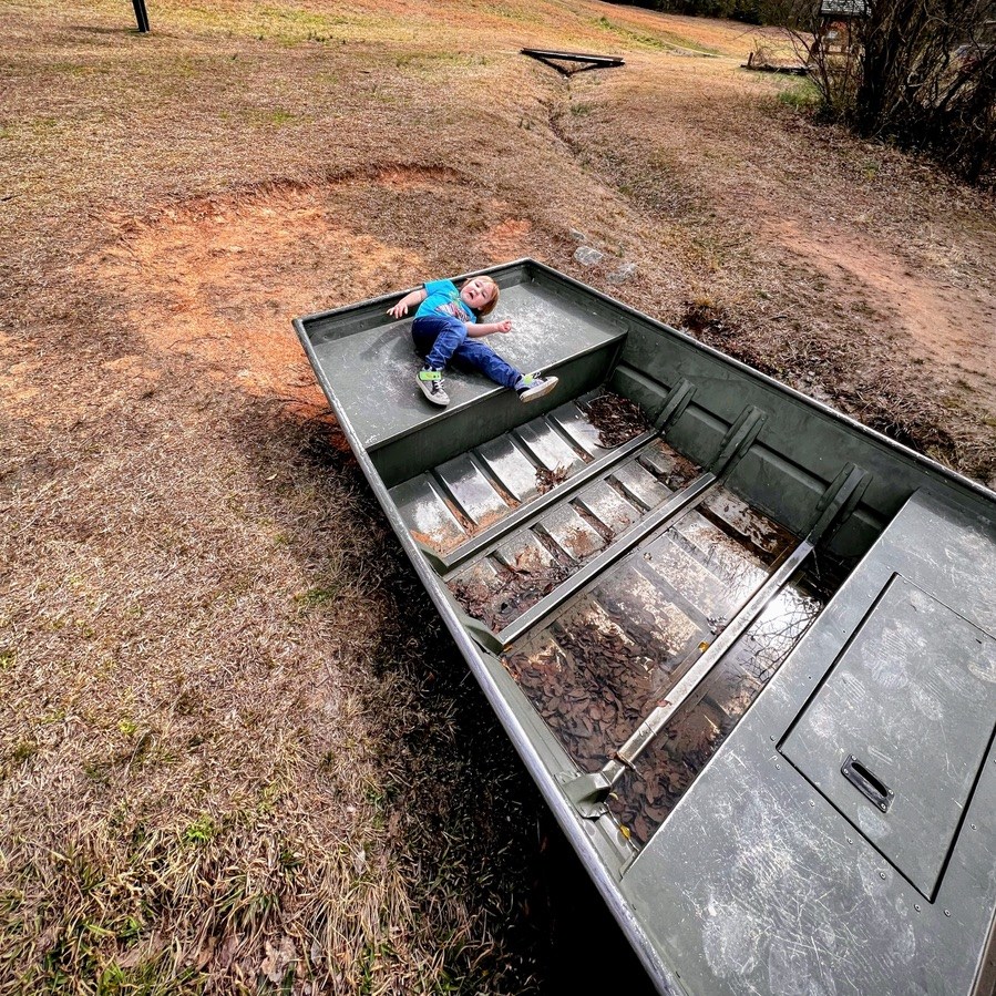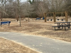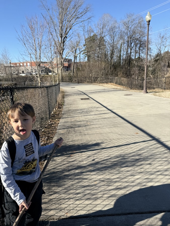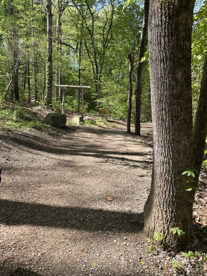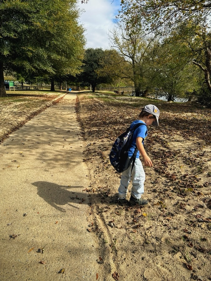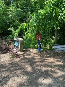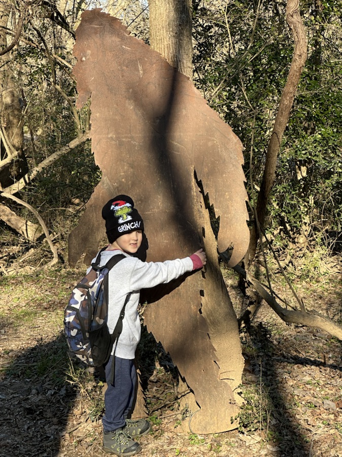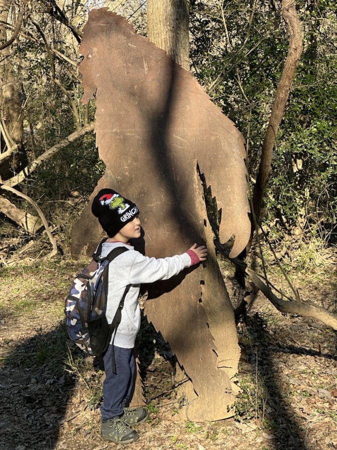 This (PPAC)of Bigfoot ( also known as Sasquatch) is located on the Disc Golf Trail at Goat Island Park and Greenway in Cramerton, North Carolina. This is the first time Coleman and I hiked this trail since Hurricane Helene. After the flood damage to the trail in the aftermath of Hurricane Helene; the trail was blocked off prohibiting access temporarily until repairs could be completed. We did not recall seeing Sasquatch previously. Coleman was fascinated by the Bigfoot and had to check it out.