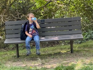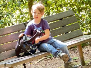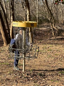 Coleman checking out the Disc Golf Catcher at Goat Island Park and Greenway