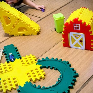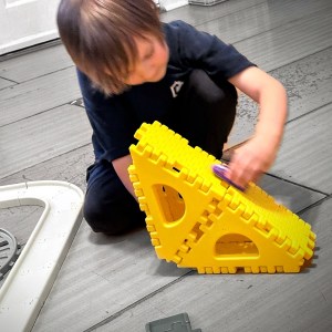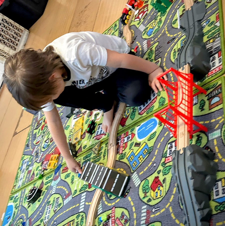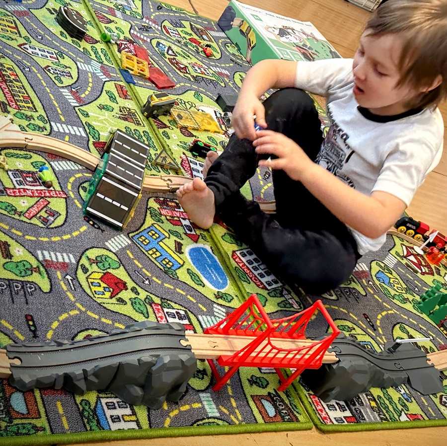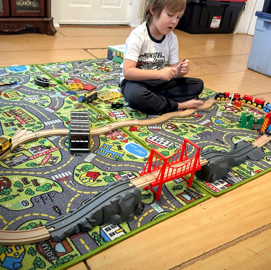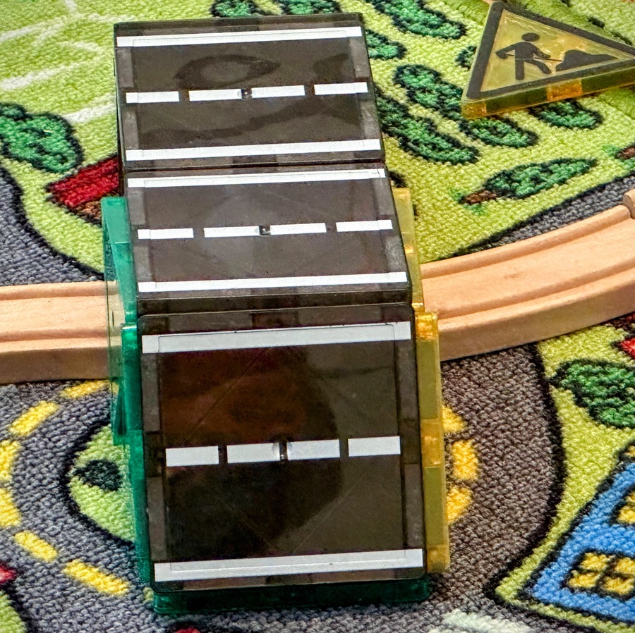 Coleman used his MagnaTiles to construct a bridge over his Brio Railroad Track so his Hot Wheels cars could drive over the track while his Brio trains chug chug chugged down his track.