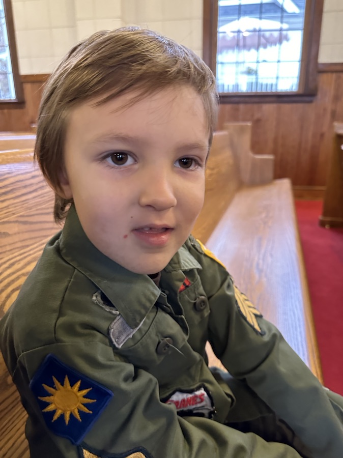 Coleman actually sat quietly waiting and watching for the service to begin. (I had already explained to him that the service was to honour the Veterans, the men and women who served in the military, like his Pawpaw had served.) [FYI – the patches on Coleman’s shirt were his Pawpaw’s patches from when he served in the U. S. Army.]