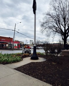 From my sidewalk view … left of the flagpole stood a military cannon. [I didn’t expect to see the cannon on display at the post office.]