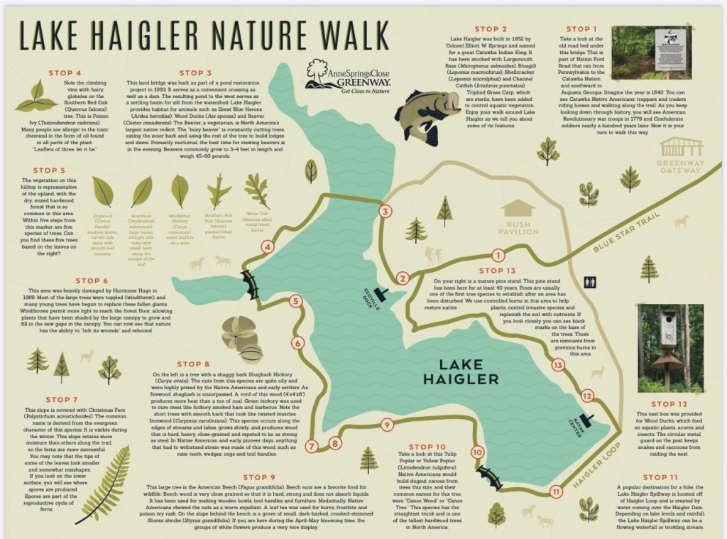 Lake Haigler is a 28-acre lake in the Anne Springs Close Greenway. It was built in 1952 by Colonel Elliott W. Springs. It was named for a great Catawba Indian King.