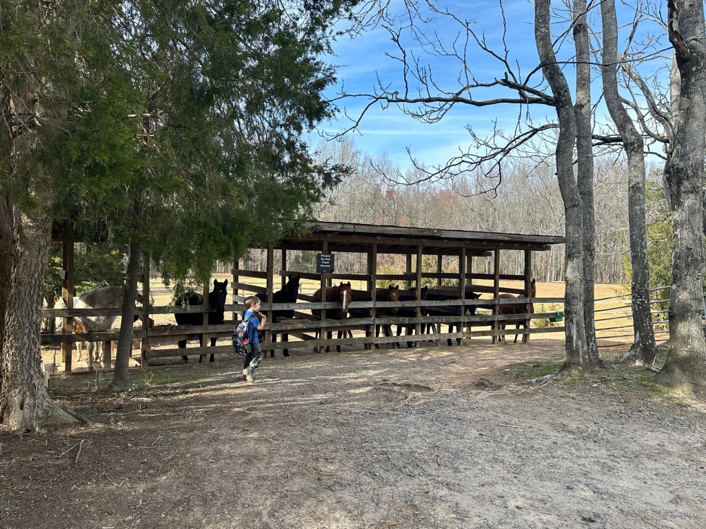 The Dairy Barn Entrance has a few different trails that can be accessed with various sites and scenery to observe. We hiked down the Blue Star Trail which leads down to the Greenway’s Spillway passing horses and the Faires/Coltharp Historic Cabin along the way.