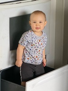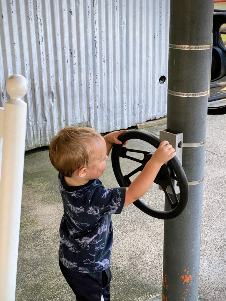 Coleman loves to stop and watch the horses. Moving along, to crossover the Spillway we had to walk across the Swinging Bridge. We stopped on both sides of the Spillway to observe the water flowing down, around, and under the Swinging Bridge.