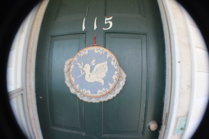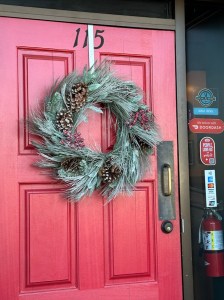 One House Door and One Business Door decorated for Christmas. We are slowly decorating for Christmas. The hanging on the first door was made in the early 1970’s in San Diego, California.