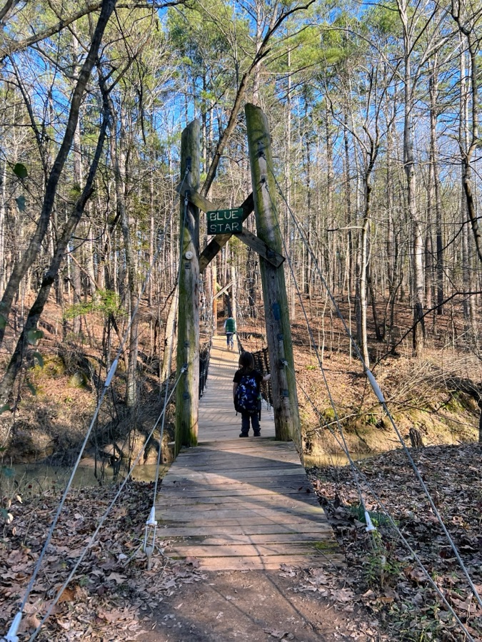 Here we are hiking at Anne Springs Close Greenway beginning on North Steele Creek Trail and crossing onto the Blue Star Trail.