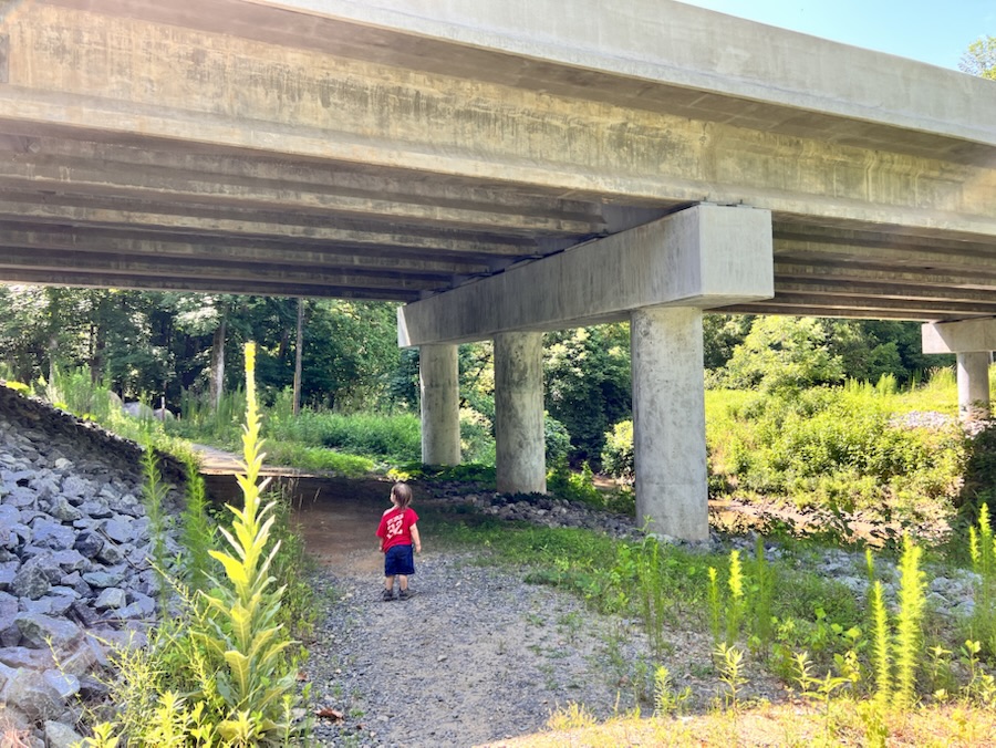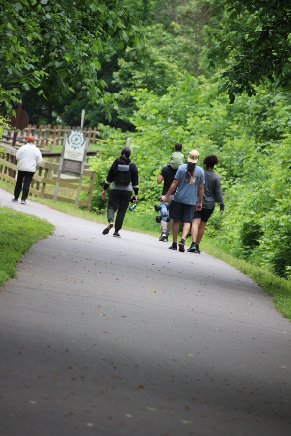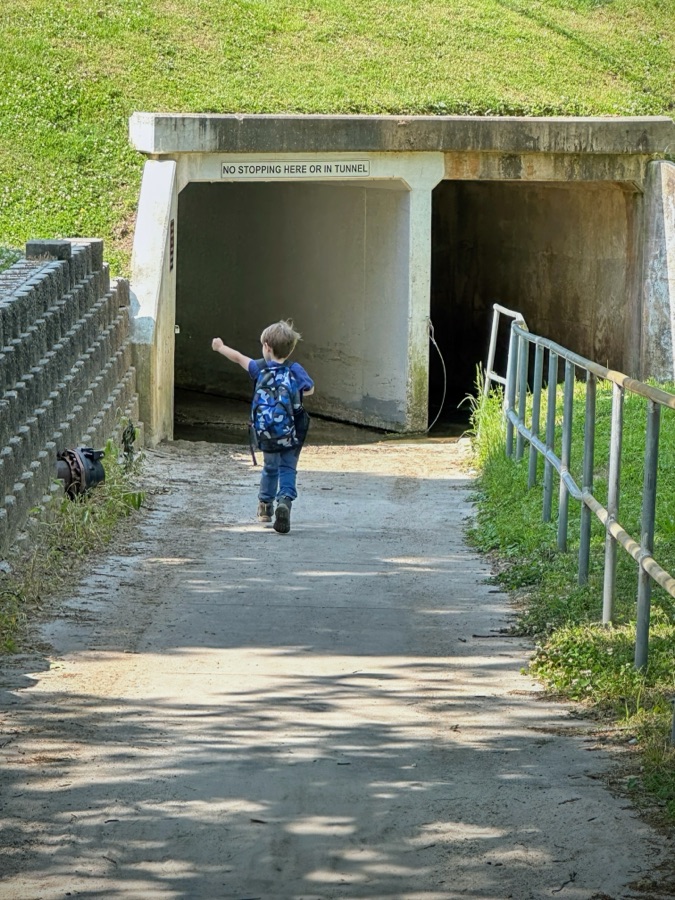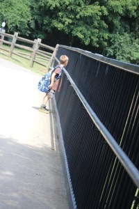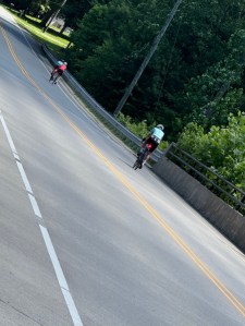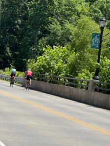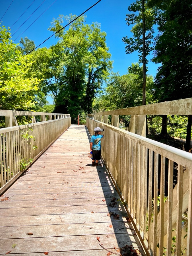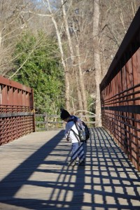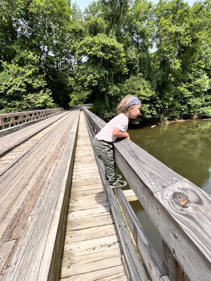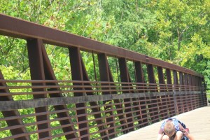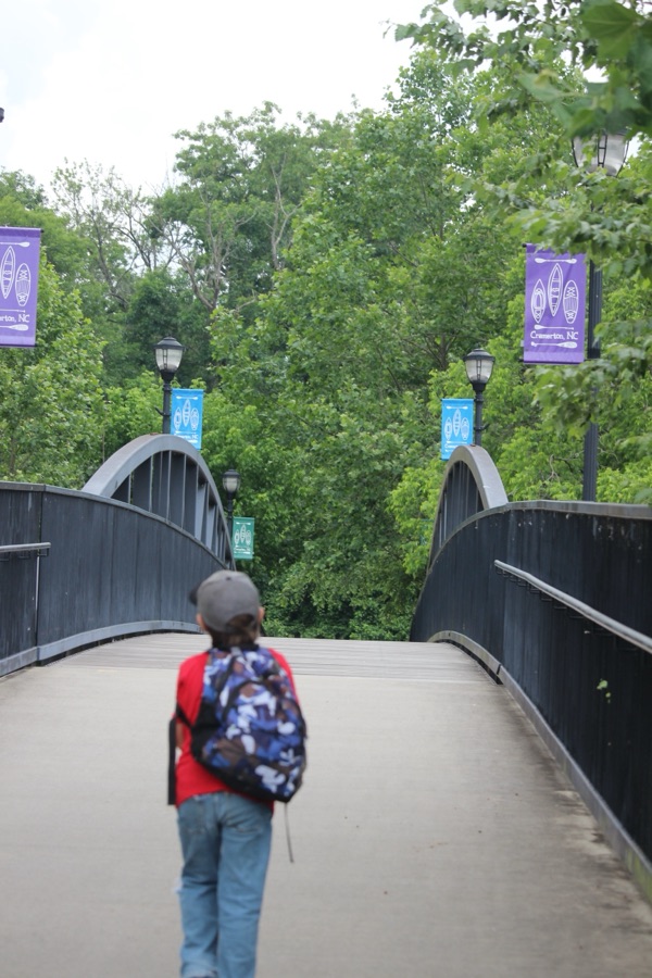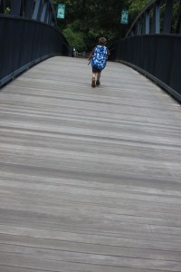 As we near the end of the bridge heading back to the entrance, we see a family approaching our way. One of the little girls is attempting to ride her bike up the hill.