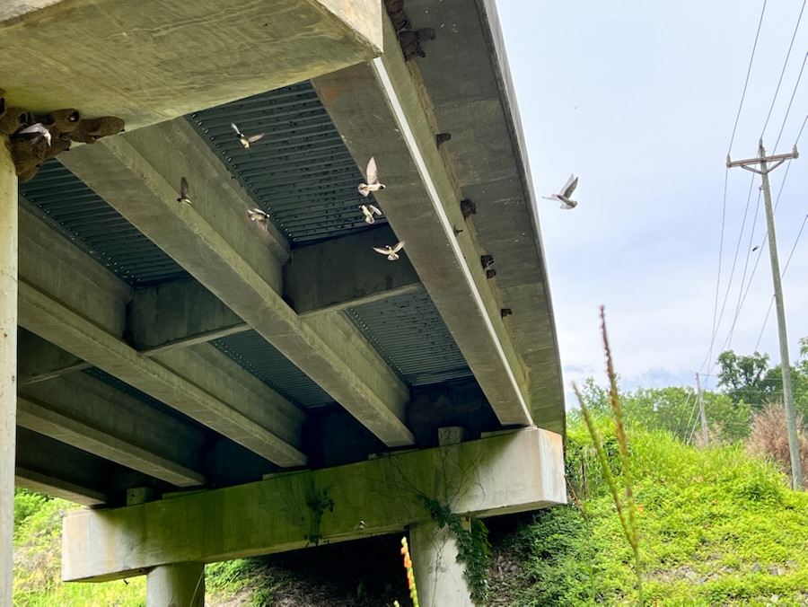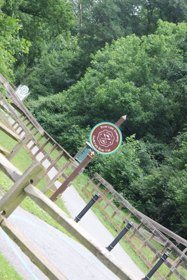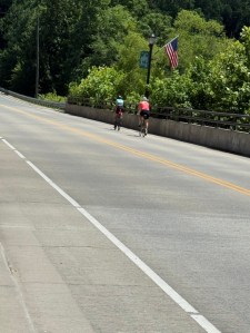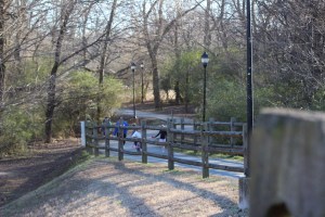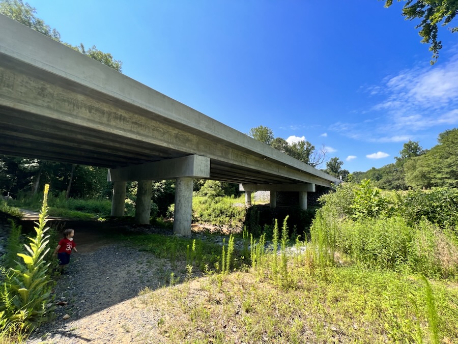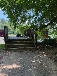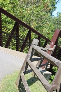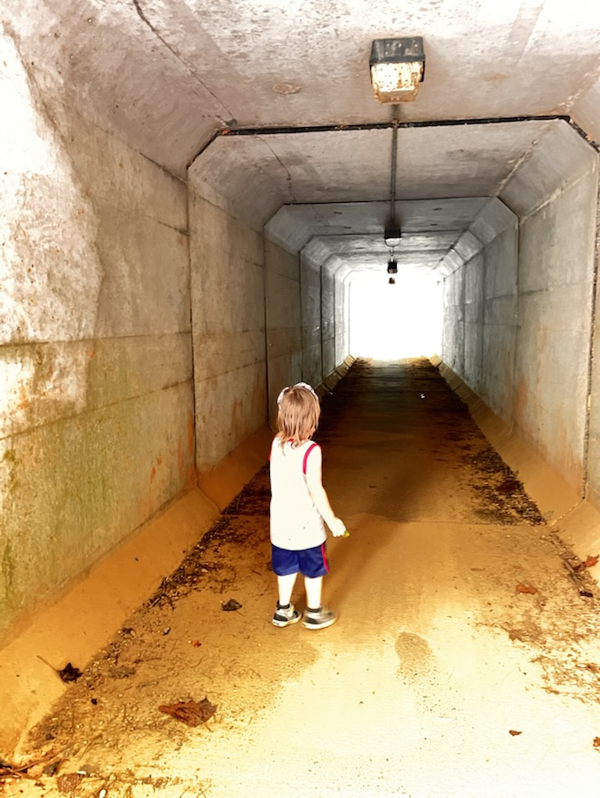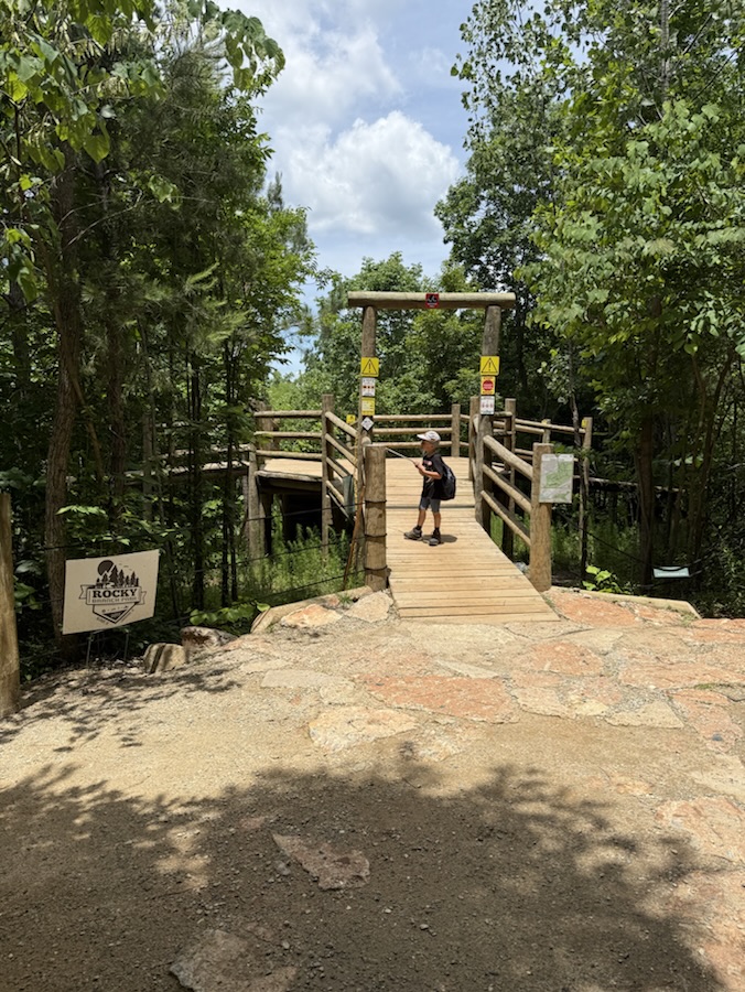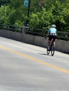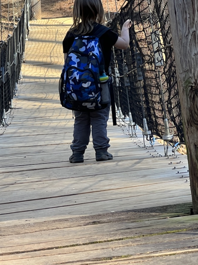 As we near the end of the bridge heading back to the entrance, we see a family approaching our way. One of the little girls is attempting to ride her bike up the hill.