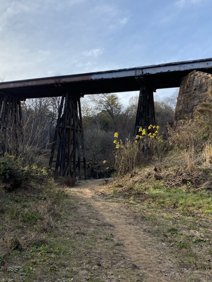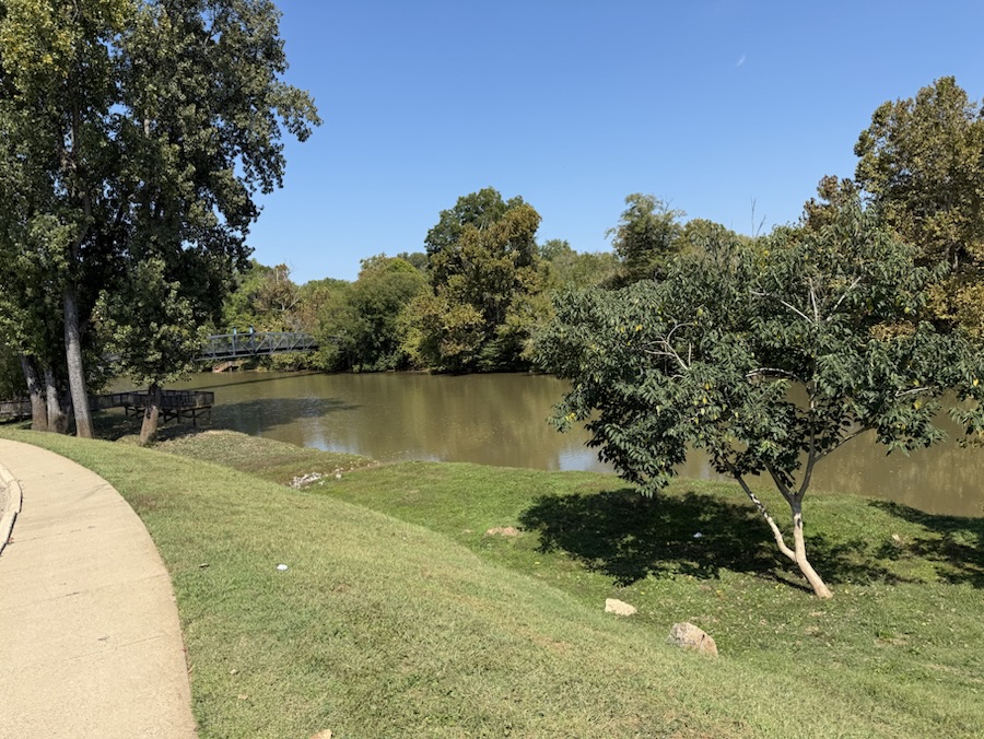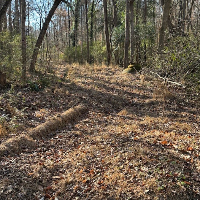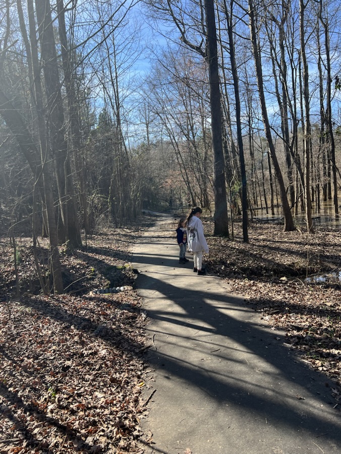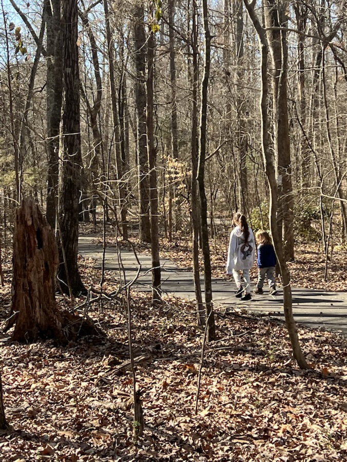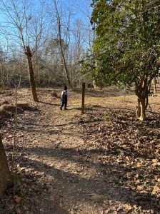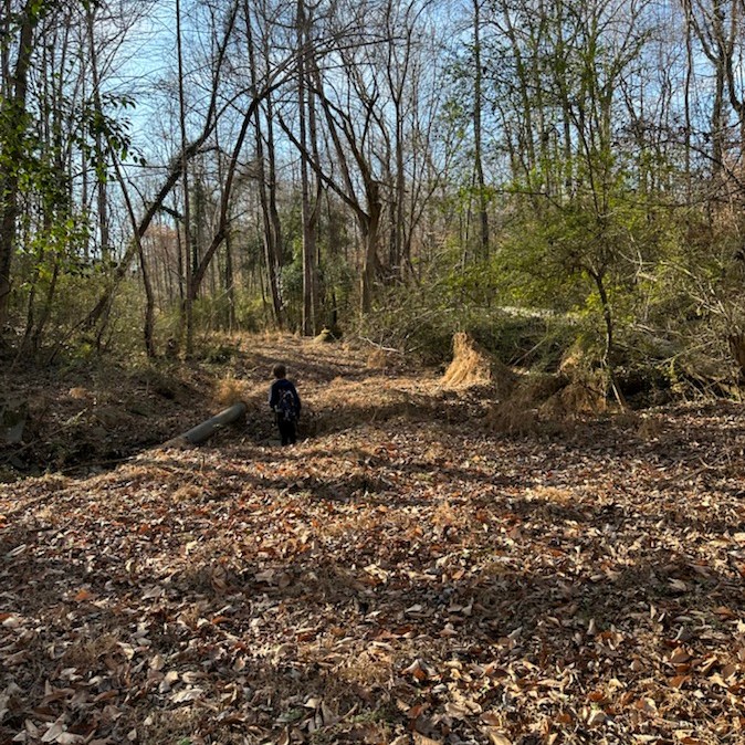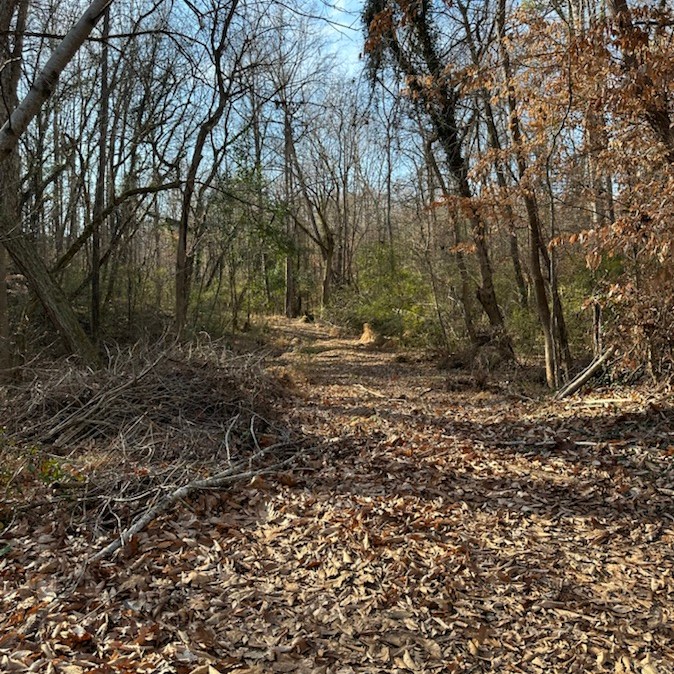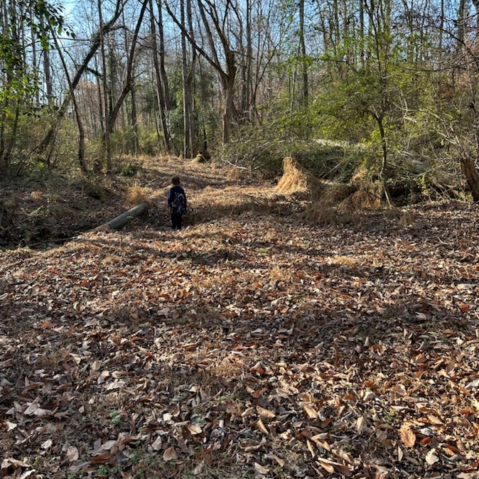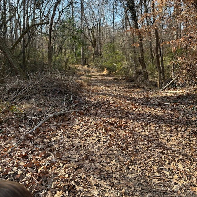 These are leaf covered dirt trails at the Historic Baltimore Fishing Pier location in Cramerton, North Carolina. Coleman and I hiked them, on Christmas Day, to see where they’d take us. Unfortunately, due to unrepaired damage to the trails from Hurricane Helene, parts of the trails are unrestored and nonfunctional at this time.