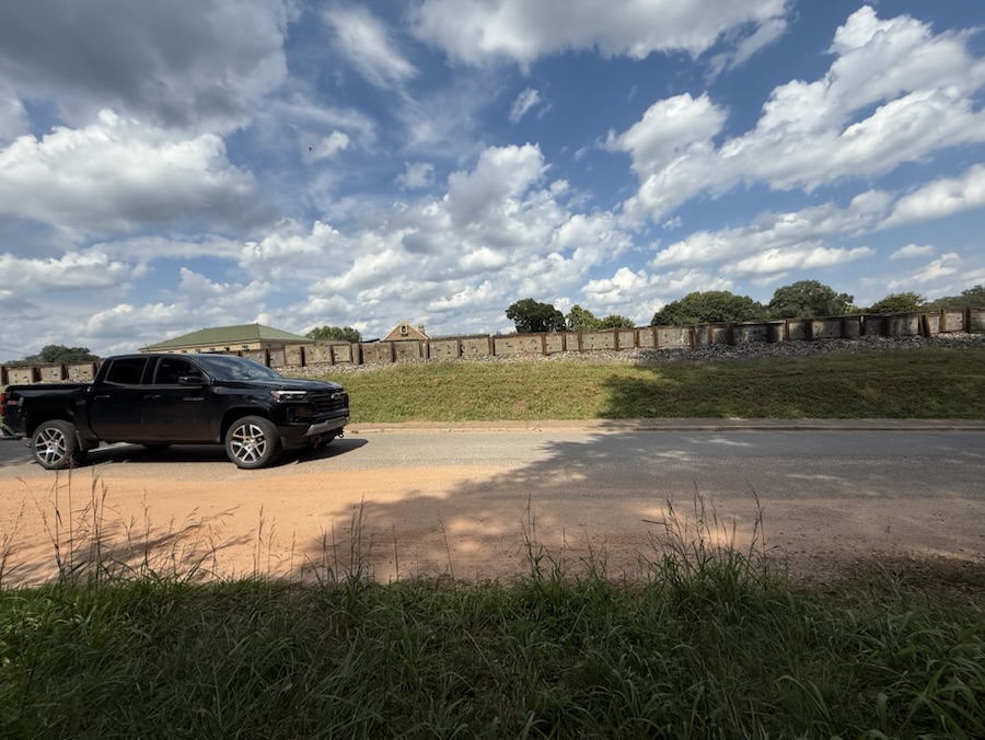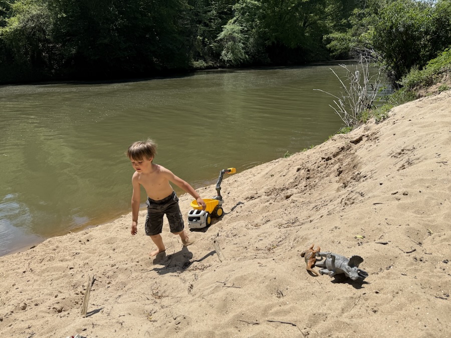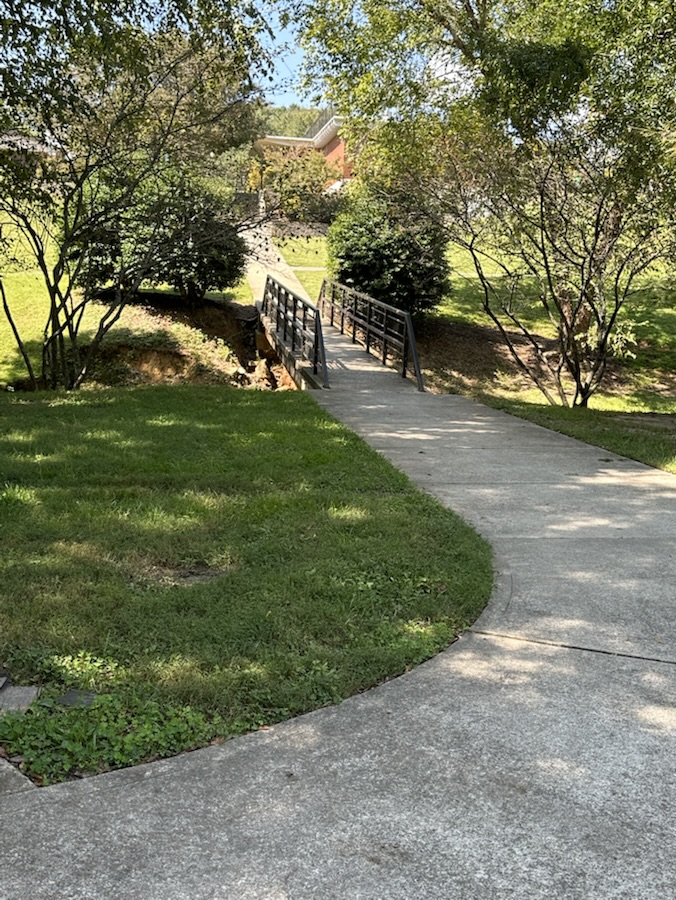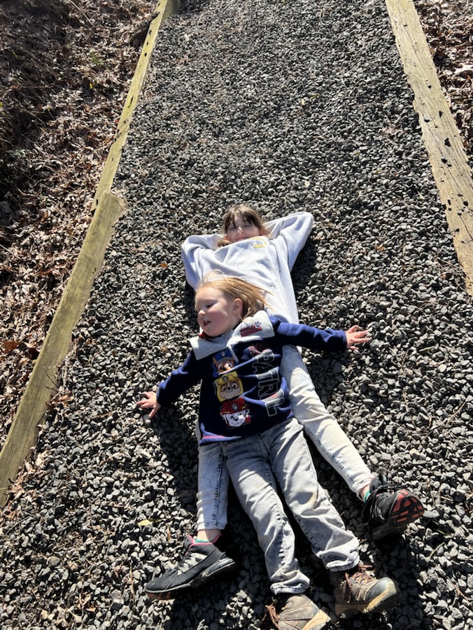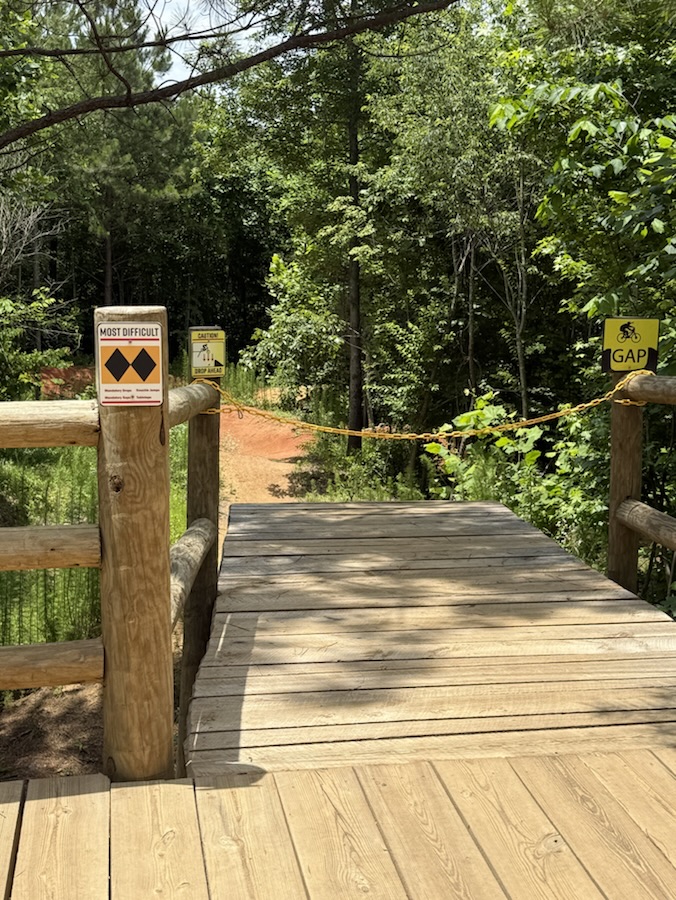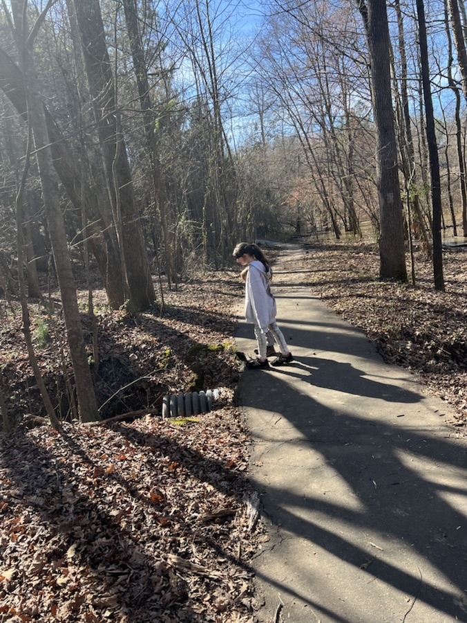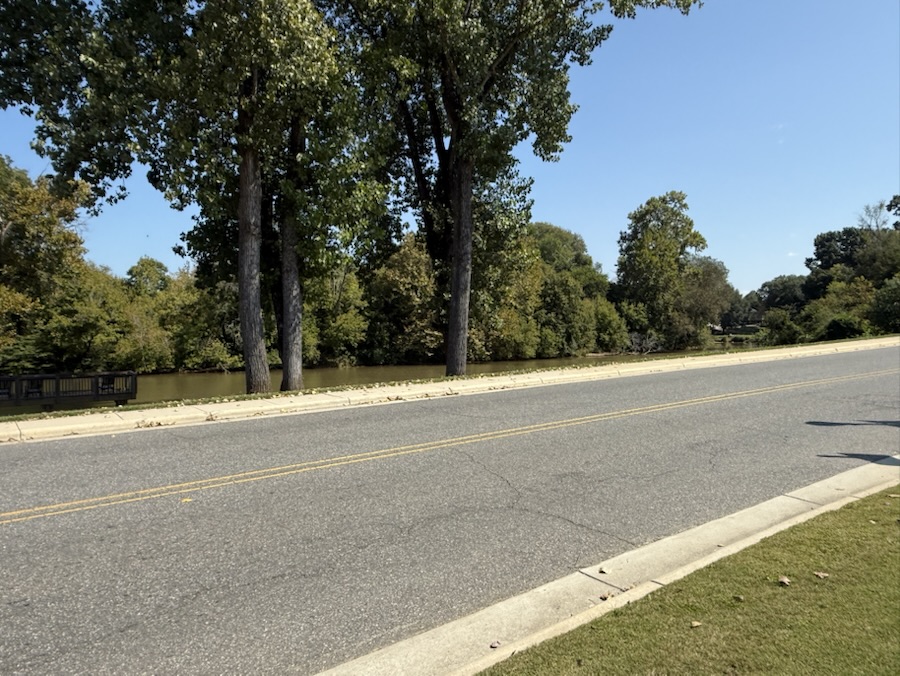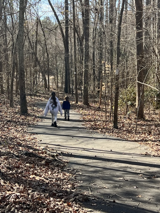 These are leaf covered dirt trails at the Historic Baltimore Fishing Pier location in Cramerton, North Carolina. Coleman and I hiked them, on Christmas Day, to see where they’d take us. Unfortunately, due to unrepaired damage to the trails from Hurricane Helene, parts of the trails are unrestored and nonfunctional at this time.