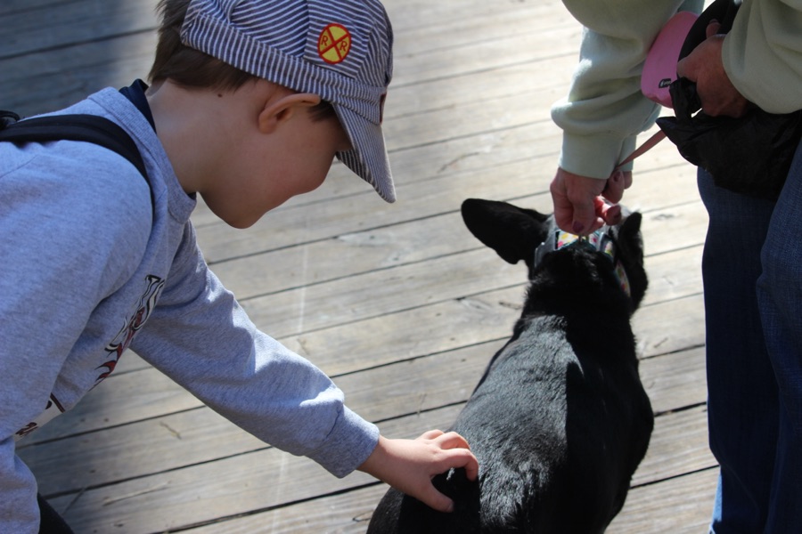 Coleman on Goat Island BridgeColeman waiting for me to catch up. He’s looking through the fence lines hoping he can go play on the playground. Another Bridge & fence rails in Goat Island Park and Greenway Coleman checking the lines in the wood planks is a bridge. A Blooper – It does show the lines in the wooden sitting area at the end of the trailColeman + all sorts of linesColeman at Goat Island Park and Greenway
