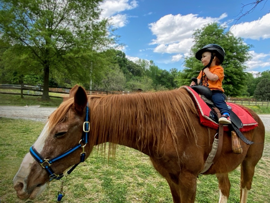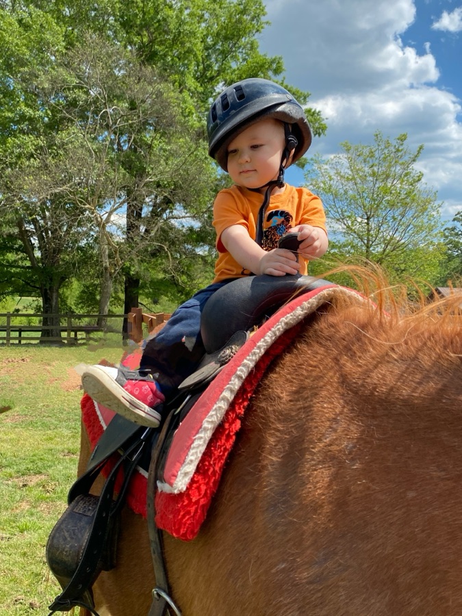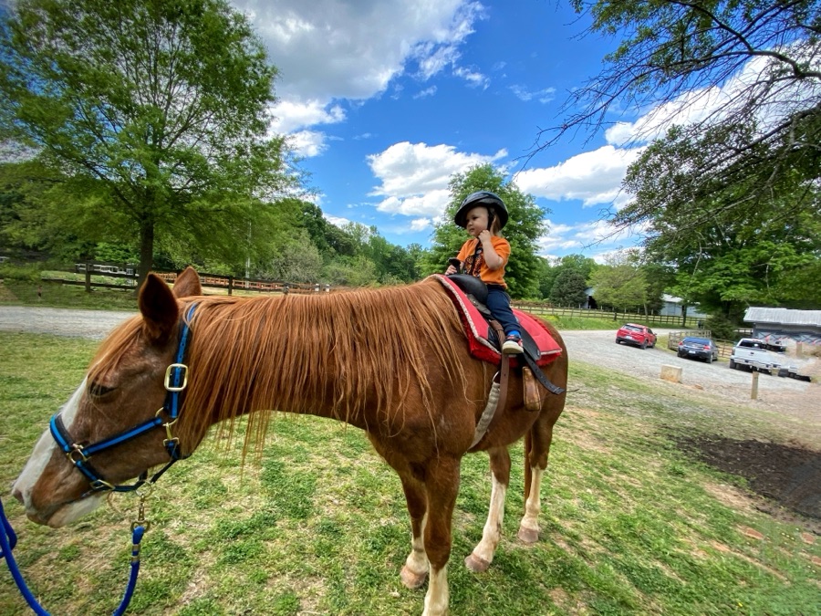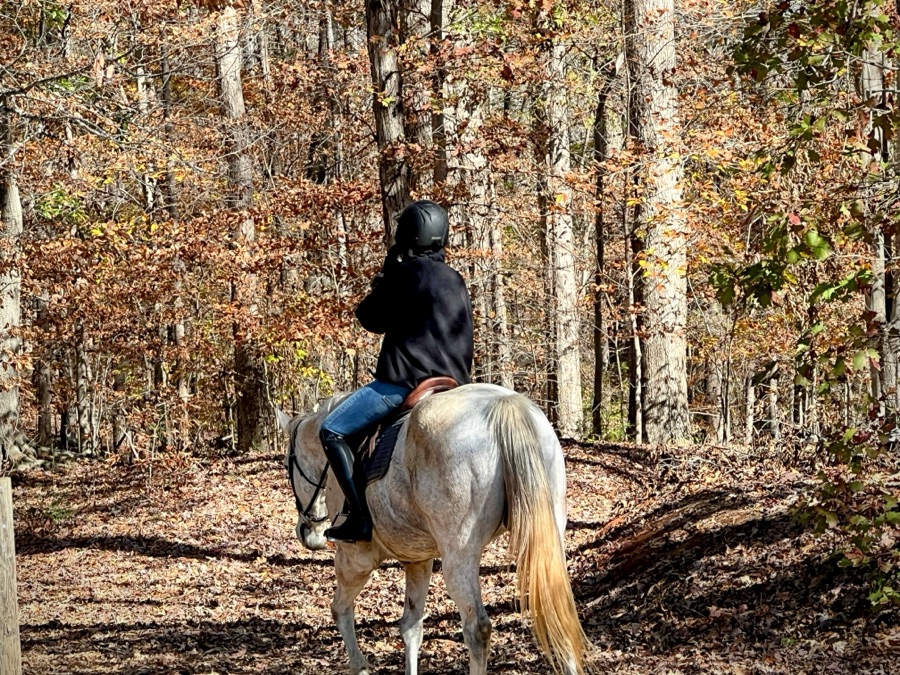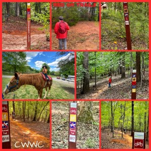 RED Jacket, RED backpack, RED on Trail Signs, RED Horse Blanket, and a RED car at Anne Springs Close Greenway