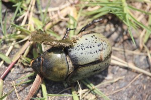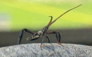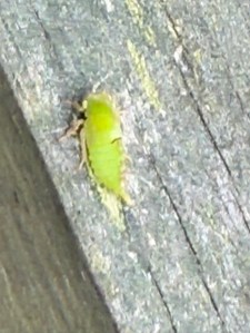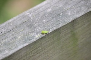 Further down the trail Coleman spotted this little creature, a nymph Threecornered alfalfa hopper. For Coleman he had get closer and look up on the fence railing to get a better view, while I zoomed in looking down upon the little green nymph.