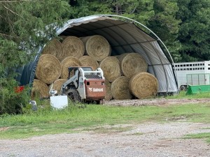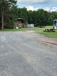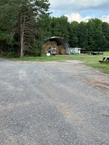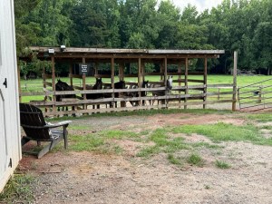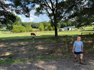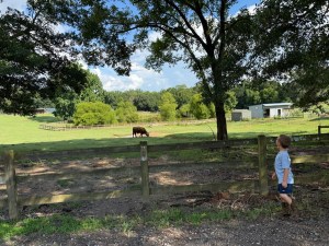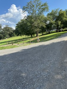 Hiking down the dirt and gravel pathway past the hay bales and the cows in the pasture we reach one of several horse stables … we visit with all the horses in the stables before turning back towards the parking area.
