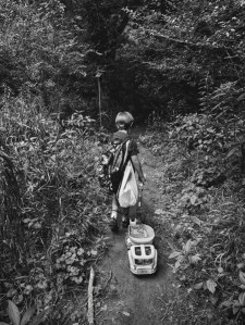 Here you can see Coleman hiking along the muddy dirt trail through the Woods pulling his Little Tike Dump Truck/Excavator. He enjoys playing the sand and this trail and sand pit is conveniently close to our home.